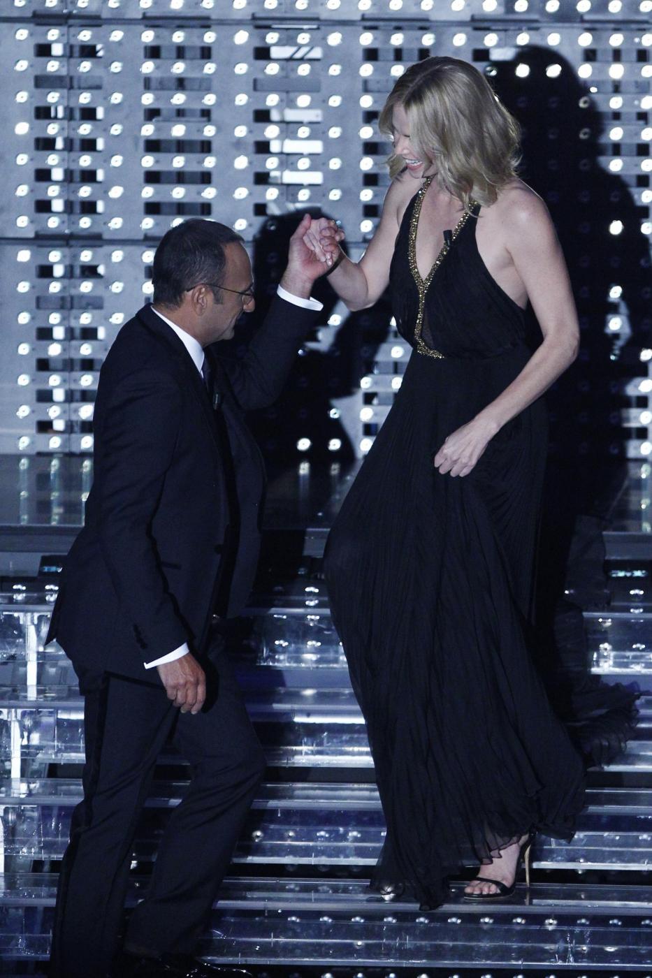 Due chiacchiere con Carlo Conti, tanta eleganza e un bacio da parte di “tutti i maschi italiani”: questa la esibizione della splendida attrice.