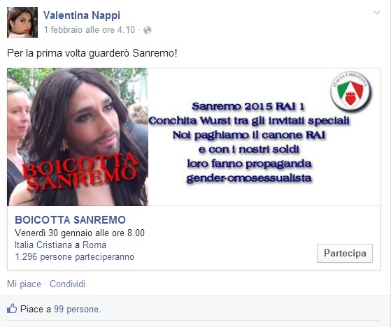 Valentina Nappi con il suo commento incita a “boicottare il boicottaggio” del Festival proposto come evento da una pagina Facebook chiamata Italia Cristiana proprio per la partecipazione di Conchita Wurst a Sanremo 2015. La pagina Facebook in questione ha creato un evento dal nome “Boicotta Sanremo”, in cui ha dichiarato esplicitamente in un’infografica di essere contraria alla partecipazione della cantante affiancando l’immagine della Wurst ad una scritta che dice: “Sanremo 2015, Rai1, Conchita Wurs tra gli invitati speciali. Noi paghiamo il canone Rai e con i nostri soldi loro fanno propaganda gender-omosessualista”.