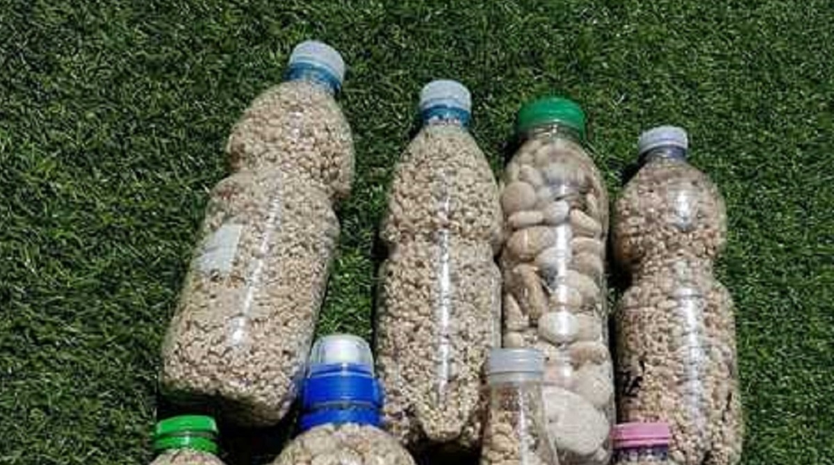 Le bottigliette piene di ciottoli (foto Facebook/Ansa)