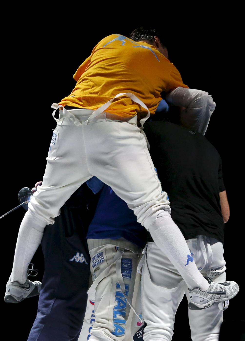 Ad Enrico Berrè viene lasciato il compito di rispondere alle domande in inglese: “gruppo fantastico – dice – e gioia immensa. Sapevamo che non era semplice ma ce l’abbiamo fatto ed abbiamo scritto la storia”. A gioire è tutto lo staff azzurro, a partire dal ct Giovanni Sirovich: “E’ un’emozione che condivido con tutti coloro che lavorano attorno a questi atleti. Da anni eravamo ai vertici senza riuscire mai a cogliere questo successo – sottolinea – E’ arrivato oggi nel migliore dei modi, dimostrando al Mondo il valore di questi ragazzi e dell’intero movimento della sciabola italiana”. Le foto dell’esultanza dei quattro atleti Azzurri (foto LaPresse).