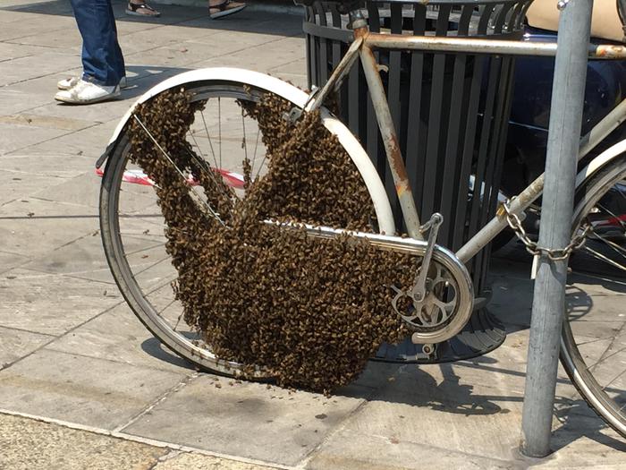 MILANO – Uno sciame di migliaia di api ha ricoperto la ruota posteriore di una bici posteggiata in corso Buenos Aires, la centralissima via dello shopping di Milano. L’insolito spettacolo ha attirato l’attenzione di molti passanti costretti ad attraversare la strada per evitare di essere punti dalle api. La polizia locale ha chiesto l’intervento di un ex ufficiale in pensione, un esperto apicoltore che in pochi minuti ha raggiunto il punto con un’arnia personale nella quale riversare gli insetti.