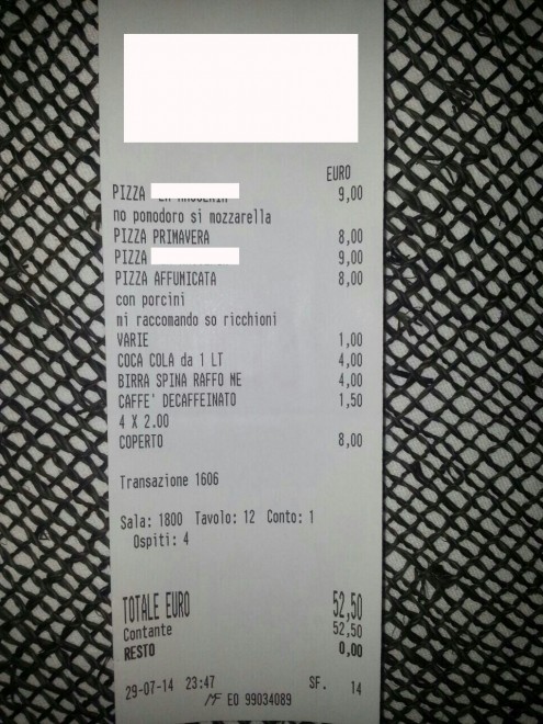 “E’ stato un errore, uno scherzo tra il cameriere e il pizzaiolo, un commento trascritto per errore sullo scontrino. Chi ci conosce sa bene che il nostro è un locale che accoglie tutti, tantissimi tipi di gente senza alcuna discriminazione”.