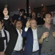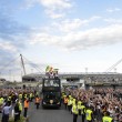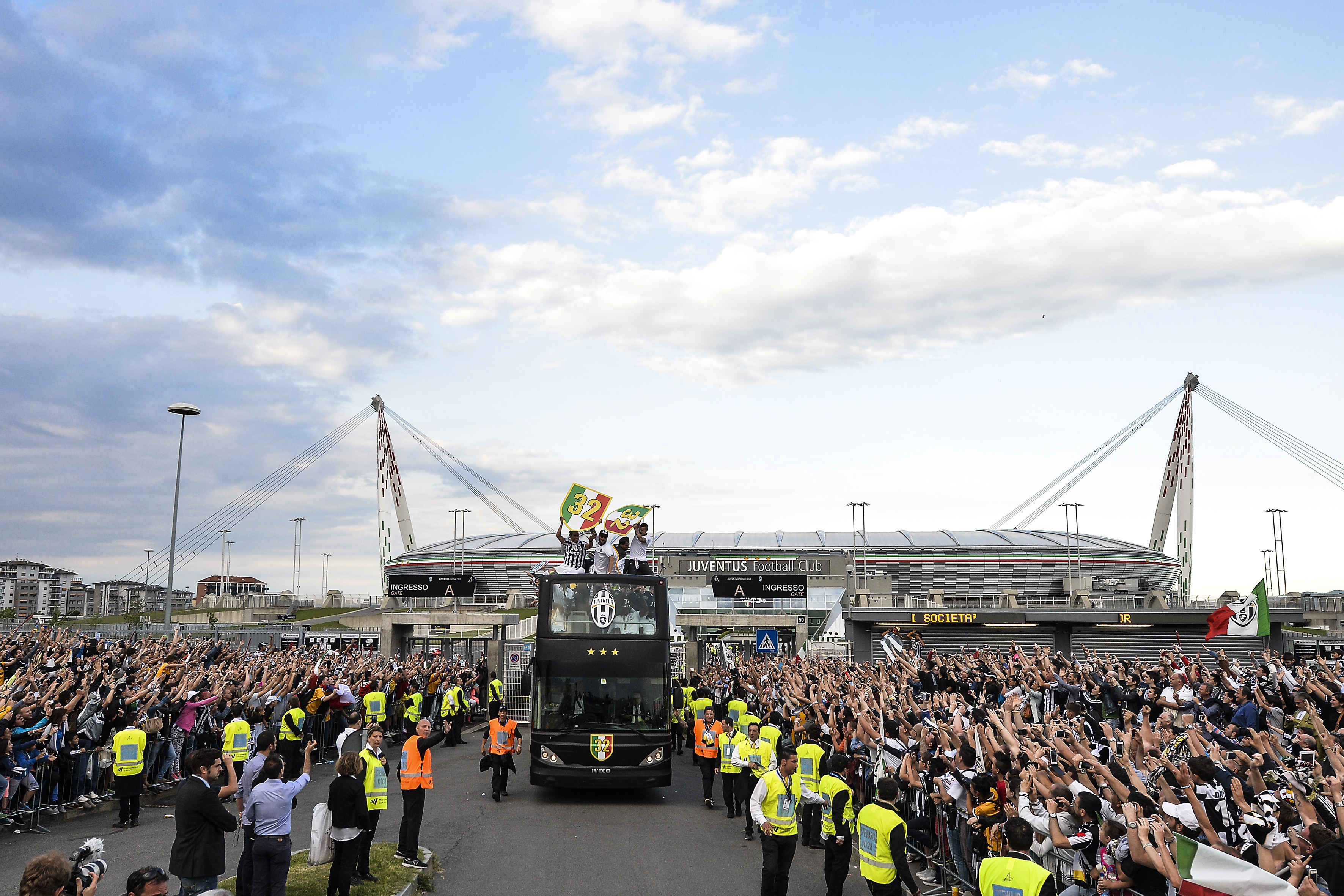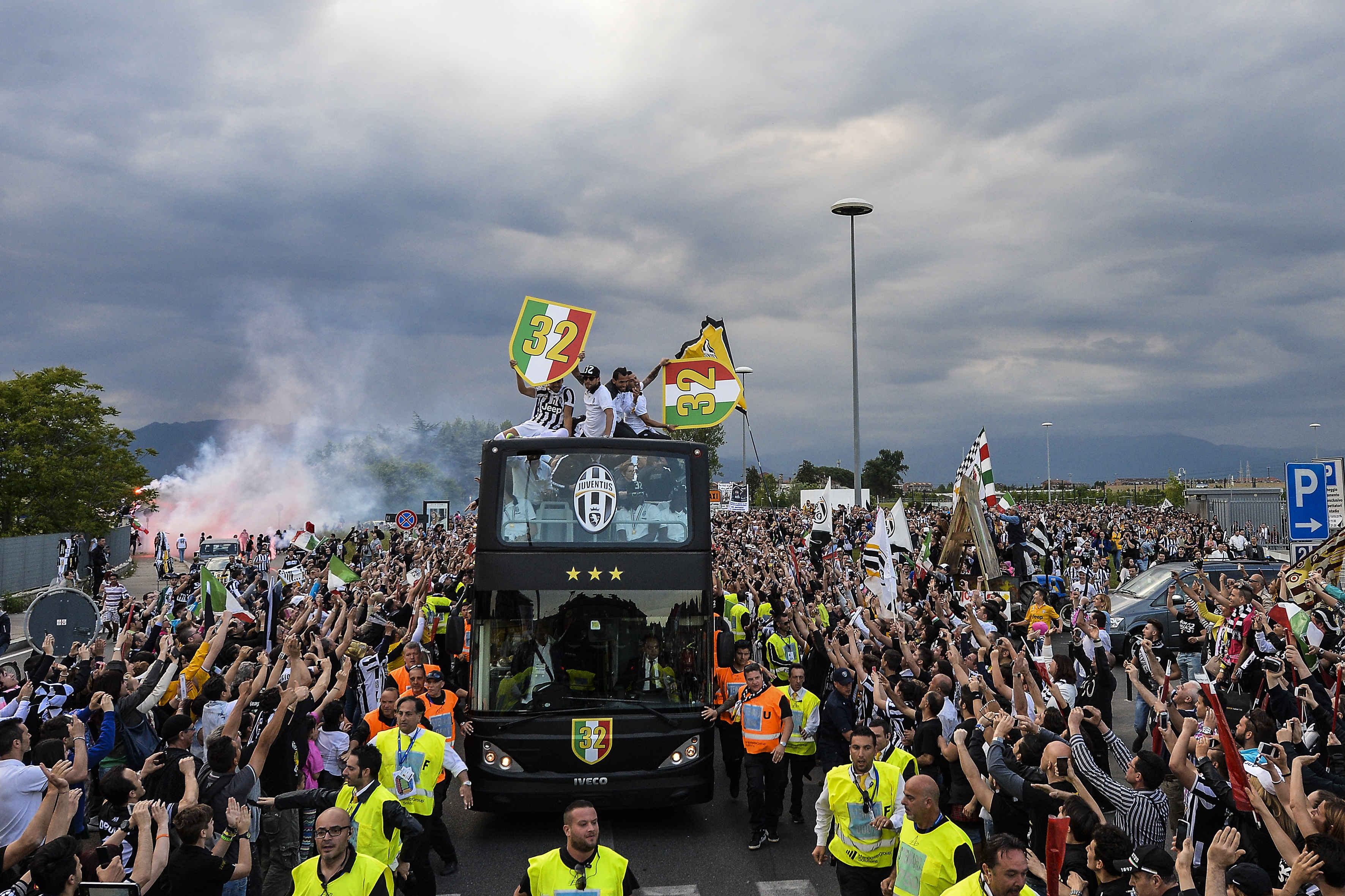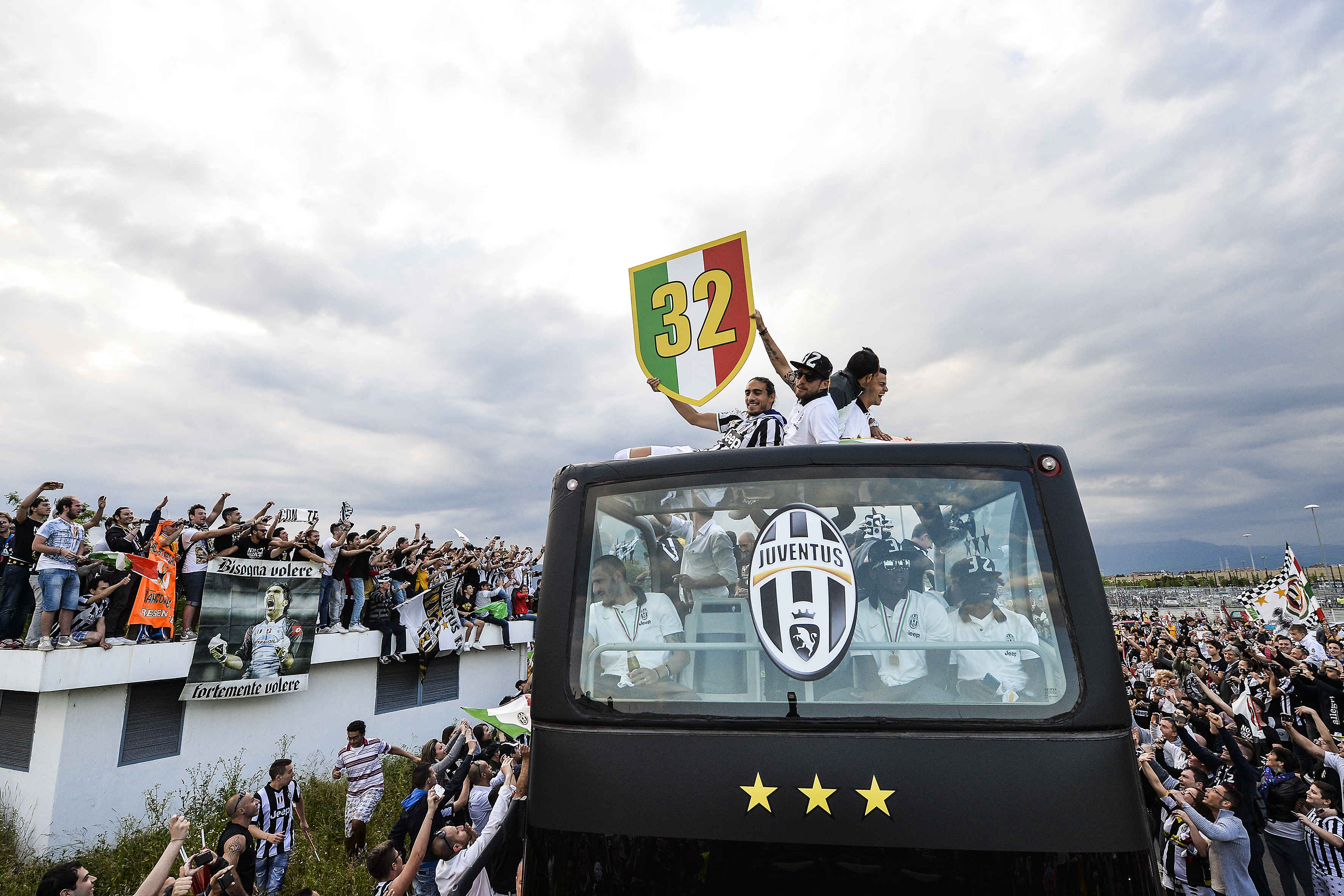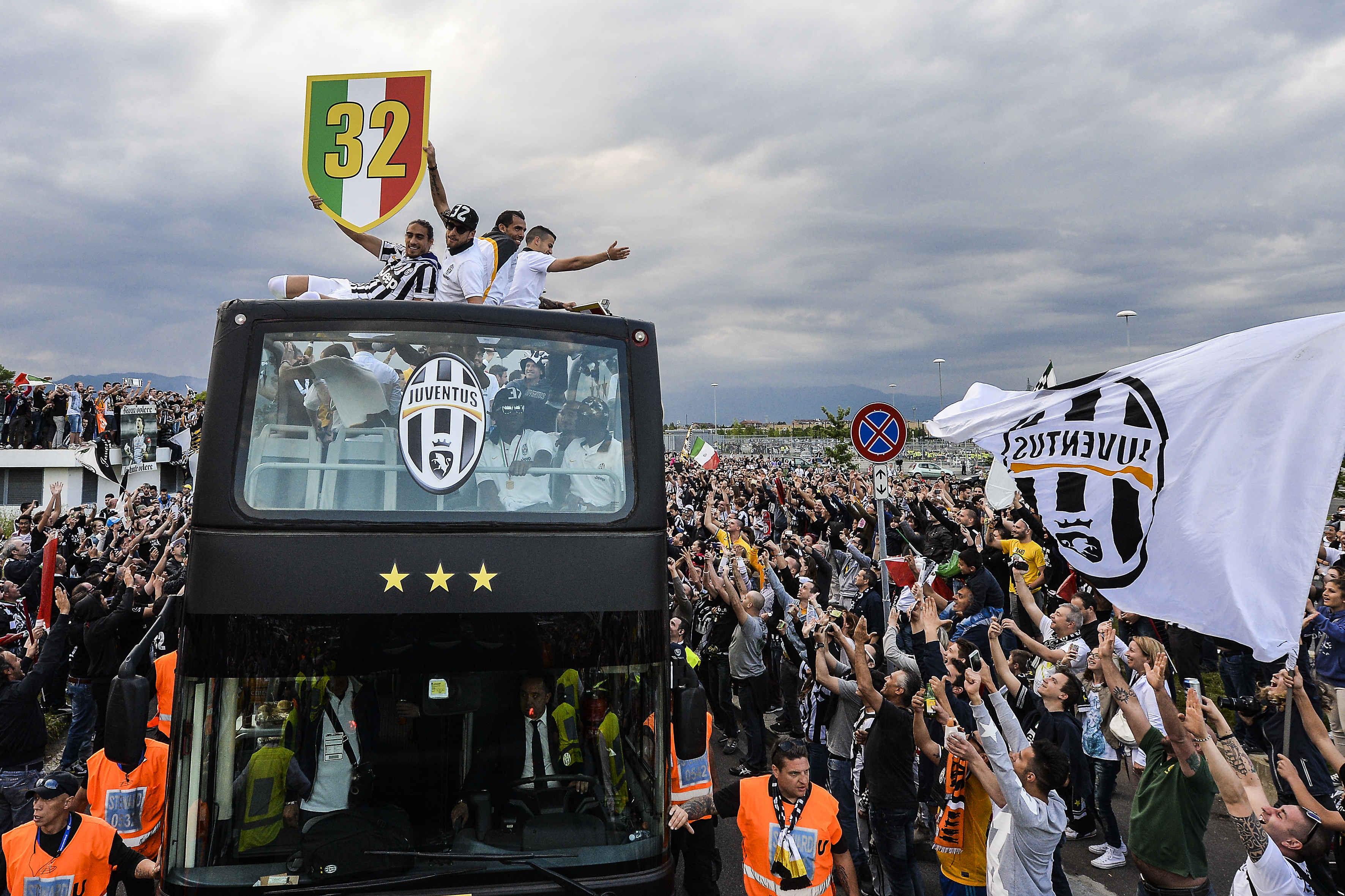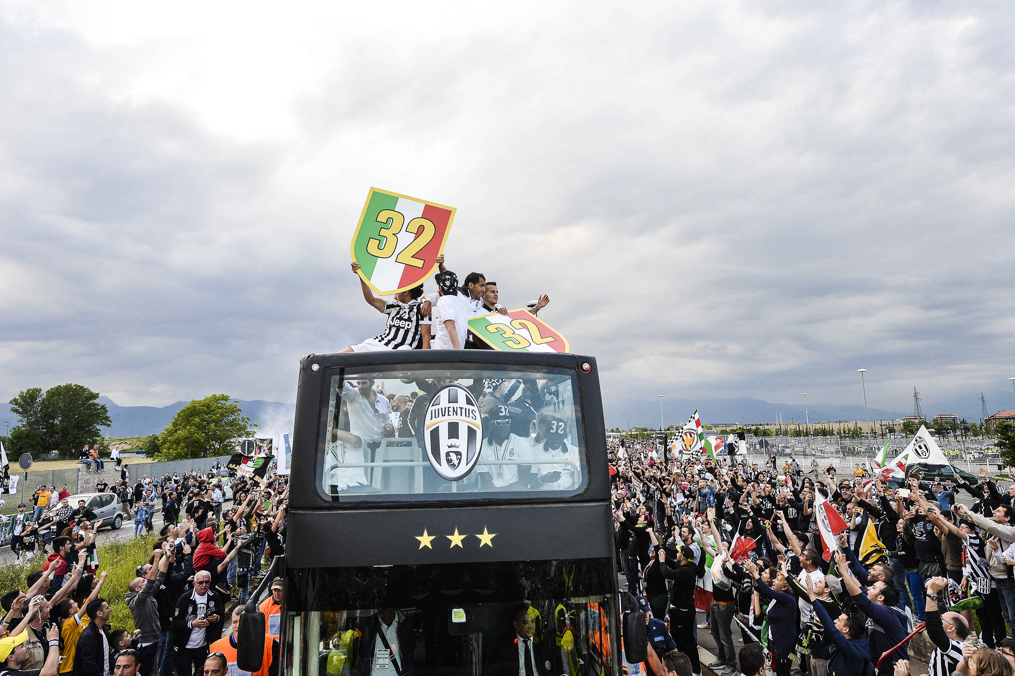 TORINO – Espongono uno scudetto tricolore con il numero 32 i giocatori della Juventus appena partiti dallo stadio a bordo del pullman scoperto con cui sfileranno nel centro di Torino.