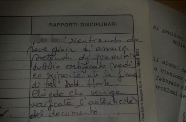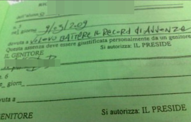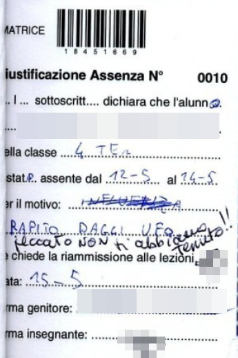 ROMA – C’è lo studente che non si presenta a scuola e lascia sul banco un cartello con la scritta “torno subito”, quello che scrive sul libretto delle giustificazioni di essere stato “rapito dagli ufo” e un altro che la butta sul ridere scrivendo di aver voluto battere il record di assenze: varia la gamma di giustificazioni dei ragazzi italiani. Le più bizzarre sono state raccolte dal Secolo d’Italia.