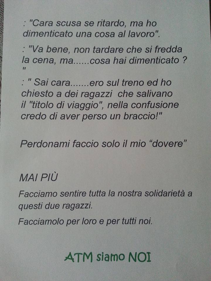 MILANO – “Scusa il ritardo ho perso un braccio”. E’ un cartello choc quello che fa capolino su alcuni autobus Atm di Milano. Cartello che ricorda quanto accaduto al capotreno aggredito a colpi di machete da un gruppo di sudamericani a cui aveva semplicemente chiesto di mostrare il biglietto.