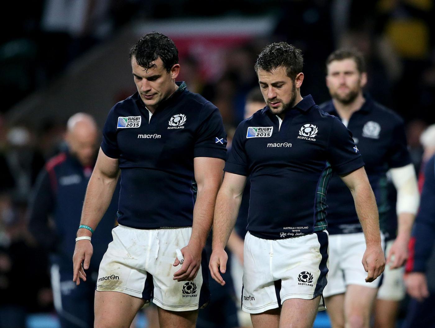 File photo dated 18-10-2015 of Scotland’s Greig Laidlaw (right) and John Hardie appear dejected after the Rugby World Cup match at Twickenham Stadium, London. PRESS ASSOCIATION Photo. Issue date: Thursday January 28, 2016. Wales, meanwhile, should be buoyed by a Six Nations trend of them winning a Grand Slam immediately after a World Cup (2007 and 2011), while Scotland, possibly still reeling from the horrible injustice that engulfed their World Cup exit in October, look in excellent shape. See PA story RUGBYU Six Nations Overview. Photo credit should read Gareth Fuller/PA Wire. LaPresse Only italyCampionato RBS 6 Nazioni – Raccolta foto storiche