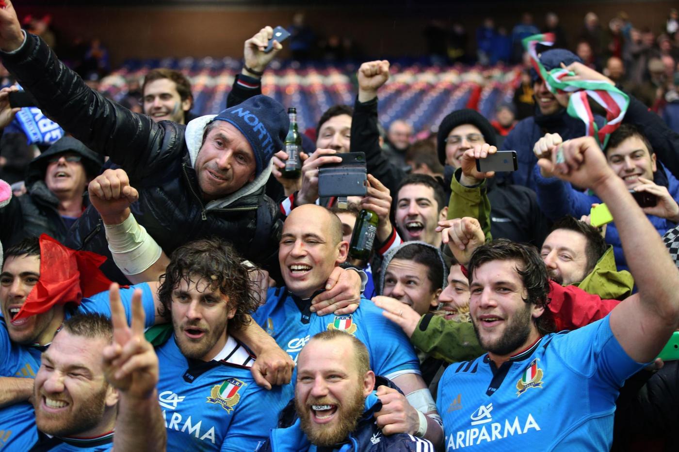 File photo dated 28-02-2015 of Italy’s captain, Sergio Parisse (centre) celebrates with their fans after the RBS Six Nations match at Murrayfield Stadium, Edinburgh. PRESS ASSOCIATION Photo. Issue date: Thursday January 28, 2016. If that looked like heralding a new dawn, it was a false one as Italy the following year were whitewashed once more, and last season they avoided the same fate with only their second away win, again in Edinburgh. See PA story RUGBYU Six Nations Italy. Photo credit should read Lynne Cameron/PA Wire. LaPresse Only italyCampionato RBS 6 Nazioni – Raccolta foto storiche