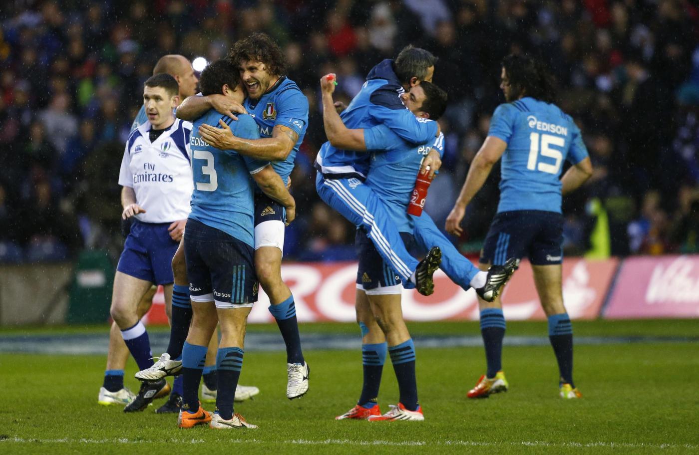 File photo dated 28-02-2015 of Italy’s Luca Morisi and Luke McLean celebrate after the RBS Six Nations match at Murrayfield Stadium, Edinburgh. PRESS ASSOCIATION Photo. Issue date: Thursday January 28, 2016. If that looked like heralding a new dawn, it was a false one as Italy the following year were whitewashed once more, and last season they avoided the same fate with only their second away win, again in Edinburgh. See PA story RUGBYU Six Nations Italy. Photo credit should read Lynne Cameron/PA Wire. LaPresse Only italyCampionato RBS 6 Nazioni – Raccolta foto storiche