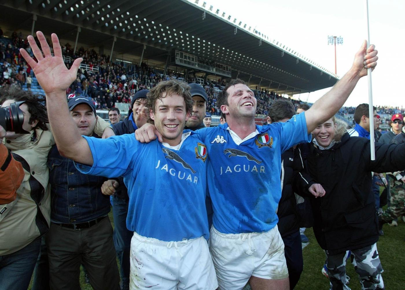 File photo dated 15-02-2003 of Italy’s Diego Dominguez (left) and Alessandro Troncon celebrate their 30-22 victory over Wales in the RBS 6 Nations game at the Stadio Flaminio, Rome. PRESS ASSOCIATION Photo. Issue date: Thursday January 28, 2016. But there were 14 more defeats before their second victory, against Wales in the opening game in 2003. See PA story RUGBYU Six Nations Italy. Photo credit should read David Davies/PA Wire. LaPresse Only italyCampionato RBS 6 Nazioni – Raccolta foto storiche