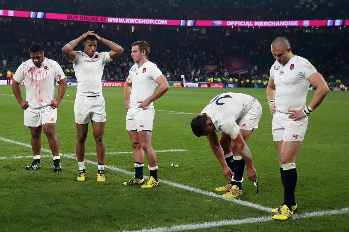 File photo dated 03-10-2015 of England’s Mako Vunipola, Anthony Watson, George Ford, Nick Easter and Mike Brown look dejected after the World Cup match at Twickenham Stadium, London. PRESS ASSOCIATION Photo. Issue date: Thursday January 28, 2016. Jones has been entrusted with the task of reviving Red Rose fortunes after last autumn???s dismal group exit from the home World Cup marked a low point in the country???s rugby history. See PA story RUGBYU Six Nations England. Photo credit should read David Davies/PA Wire.RESTRICTIONS: Use subject to restrictions. Editorial use only. No commercial use. No use in books or print sales without prior permission. Call +44 (0)1158 447447 for further information. LaPresse Only italyCampionato RBS 6 Nazioni – Raccolta foto storiche