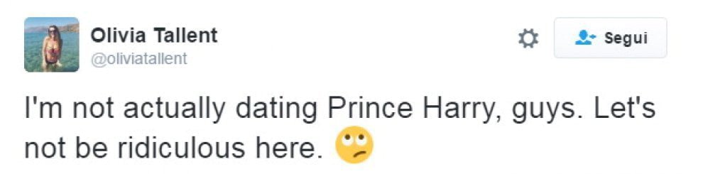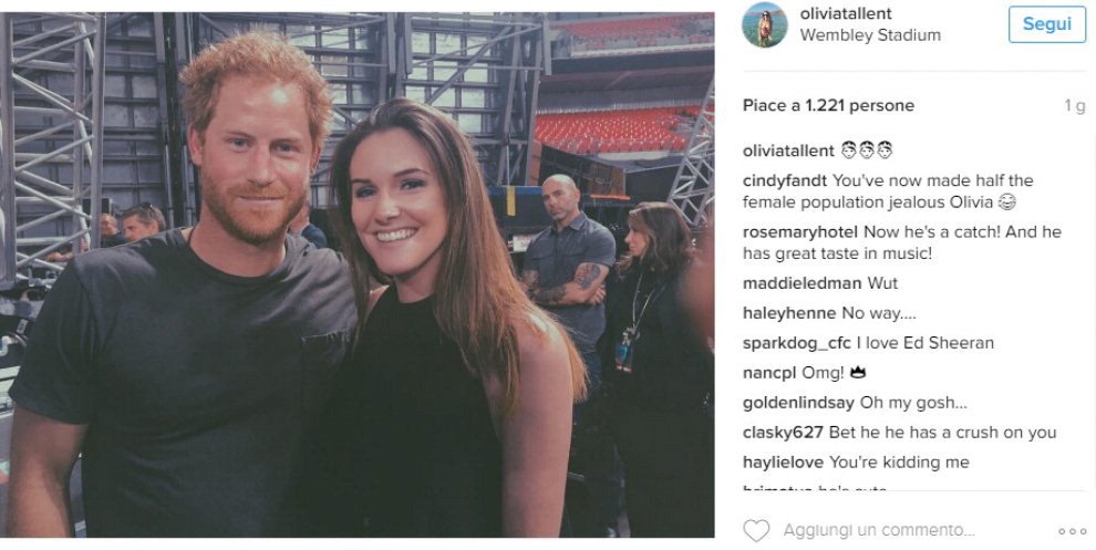 Olivia è stata così costretta a specificare il tono ironico usato nel post, scrivendo così: “Non sto uscendo con il principe Harry, ragazzi. Non siate ridicoli”. L’incontro con selfie è stata scattata nel backstage delllo stadio di Wembley a fine concerto. Il principe si trovava là dopo aver vistola band di Bruce Springsteen esibirsi sul palco.