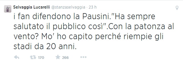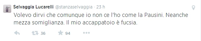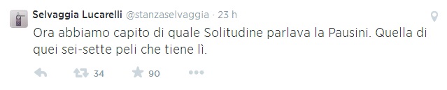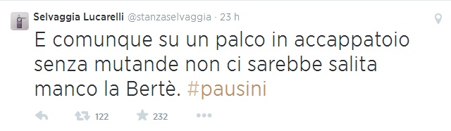 ROMA – Selvaggia Lucarelli scatenata su Twitter contro Laura Pausini e la sua esibizione senza mutande in Perù. “Ora – twitta Selvaggia Lucarelli – abbiamo capito di quale Solitudine parlava la Pausini. Quella di quei sei-sette peli che tiene lì”. E ancora: “I fan difendono la Pausini. Ha sempre salutato il pubblico così.Con la patonza al vento? Mo’ ho capito perché riempie gli stadi da 20 anni”. E ancora: “Volevo dirvi che comunque io non ce l’ho come la Pausini. Neanche mezza somiglianza. Il mio accappatoio è fucsia”. E ancora: “E comunque su un palco in accappatoio senza mutande non ci sarebbe salita manco la Bertè #pausini”.