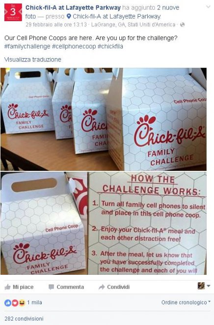 ATLANTA – “Senza smartphone mangi gratis“. E’ la sfida lanciata ai clienti dello Chick-fil-A, un fast food di La Grande, in Georgia, Usa. L’idea è di favorire la conversazione tra famigliari, fidanzati e amici affinché possano mangiare serenamente insieme e non come tanti automi con la testa china sull’iPhone.