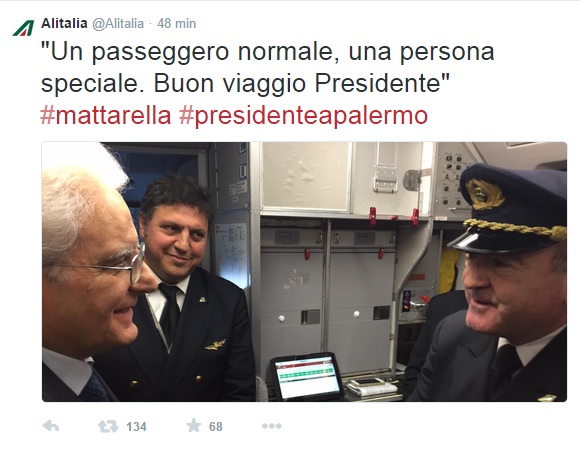 Naturalmente l’ingresso del presidente Mattarella, arrivato in auto nello scalo romano, ย ha suscitato sorpresa e curiositร da parte dei molti passeggeri che stazionavano nella hall del terminal 1.ย Questa visita di Mattarella a Palermo, la sua cittร natale, รจ la prima fuori Roma da quando circa due settimane fa รจ stato eletto presidente della Repubblica.ย LโAlitalia ha salutato il Presidente twittando sul suo account una foto di Mattarella allโingresso sullโaereo.