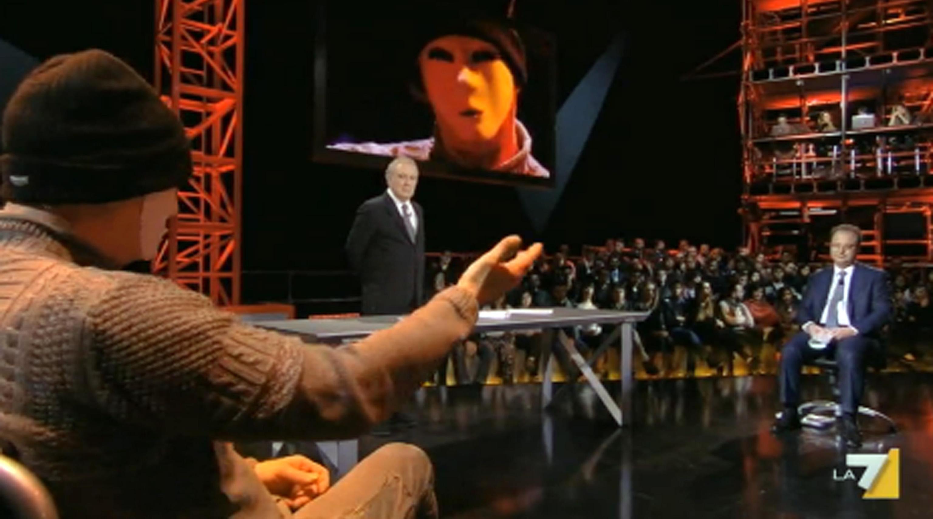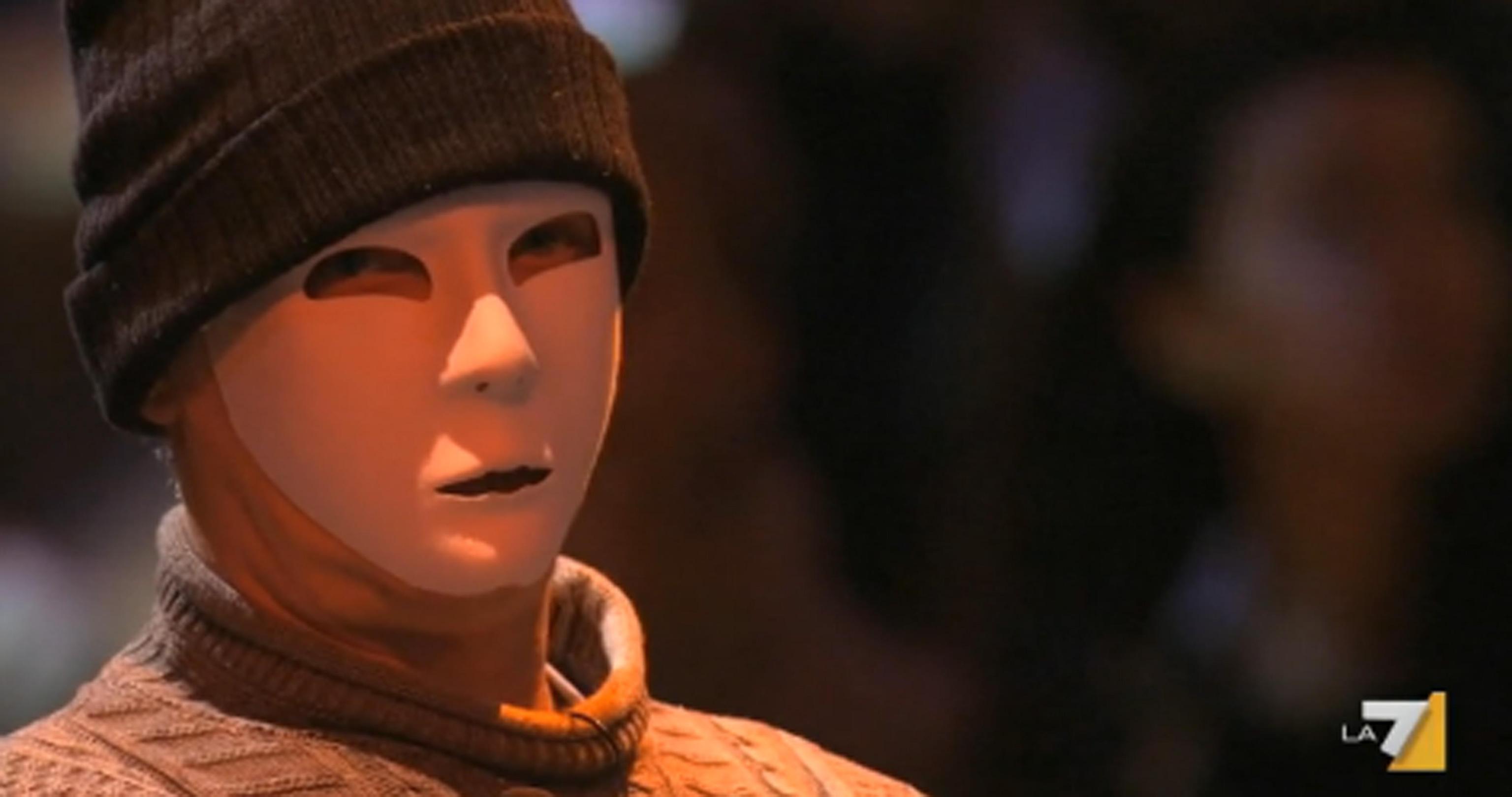 Scarantino, in trasmissione si era presentato con il volto coperto da una maschera simile a quella di Anonymous (Ansa)