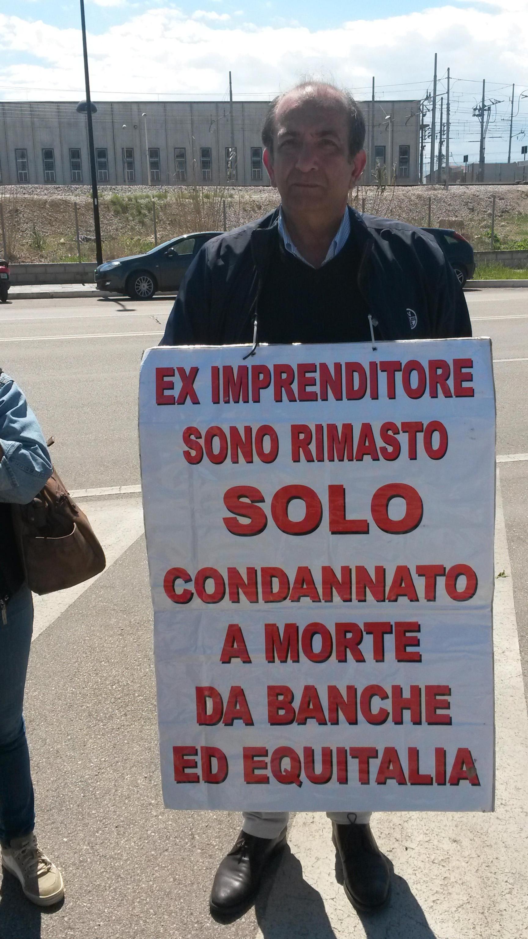 Silvio Buttiglione, cartello con scritto “Ex imprenditore, sono rimasto solo, condannato a morte da banche ed Equitalia“, come ha raccontato all’inizio, la sua vertenza economica era di 37 mila euro totali e “oggi l’asta giudiziaria per la vendita della mia casa, non ho un lavoro, banche ed Equitalia hanno distrutto la mia vita. Ho a che fare con degli usurai”.