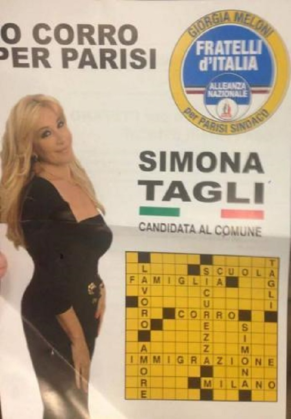 MILANO – L’ex soubrette Simona Tagli oggi 52enne, è candidata con Fratelli d’Italia a Milano. La Tagli corre per Stefano Parisi, il sindaco che a Milano ha riunito intorno a sé tutto il centrodestra. Il suo manifesto è un omaggio al cruciverbone televisivo molto in voga negli anni Ottanta e Novanta. Come spiega il sito Lettere Donna che l’ha intervistata, la Tagli vorrebbe chiudere i troppi cantieri aperti a Milano dalla giunta Pisapia per le piste ciclabili. Per lei, i