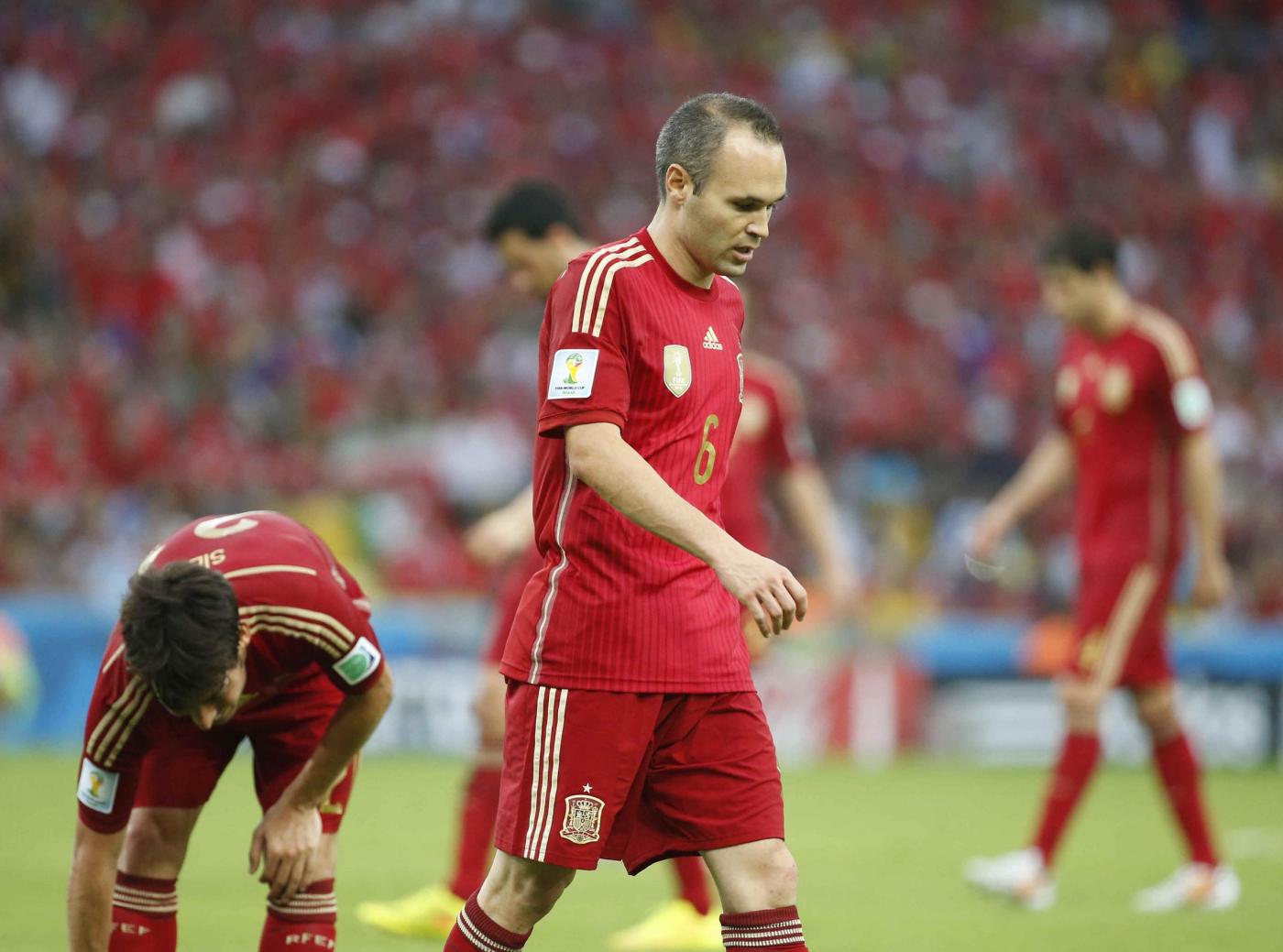Spagna (4-2-3-1): Casillas 5; Azpilicueta 4.5, Javi Martinez 5, Sergio Ramos 4.5, Jordi Alba 5; Busquets 4.5, Xabi Alonso 5 (1′ st Koke); Pedro 4.5 (30′ st st Cazorla s.v.), David Silva 5, Iniesta 5.5; Diego Costa 4 (19′ st Torres). (12 De Gea, 23 Reina, 2 Albiol, 3 Piquè, 5 Juanfran, 7 David Villa, 8 Xavi, 10 Fabregas, 13 Mata). All.: Del Bosque 4.5.