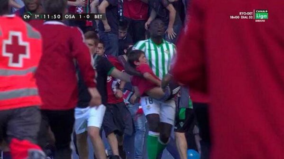 La partita,valida per l’ultima giornata della Liga spagnola, è rimasta interrotta per poco più di mezz’ora. Il crollo della barriera dello stadio, sarebbe stata provocata dall’esultanza dei tifosi. Su Twitter intanto, in molti hanno ammirato il gesto di Alfred N’Diaye, centrocampista senegalese del Betis, che porta via un bambino spaventato.