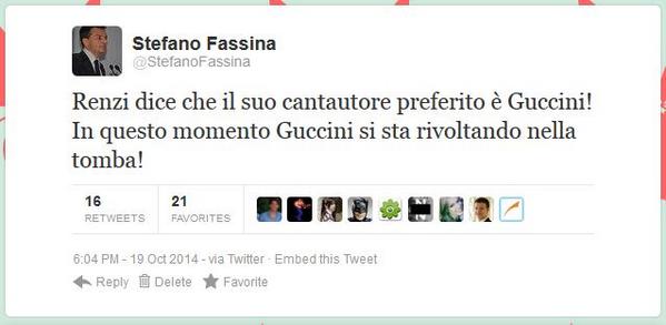 ROMA – Gaffe di Stefano Fassina su Francesco Guccini…ma è un falso. Che è successo? E’ successo che Matteo Renzi, ospite da Barbara D’Urso, ha detto che il suo cantante preferito è Guccini.