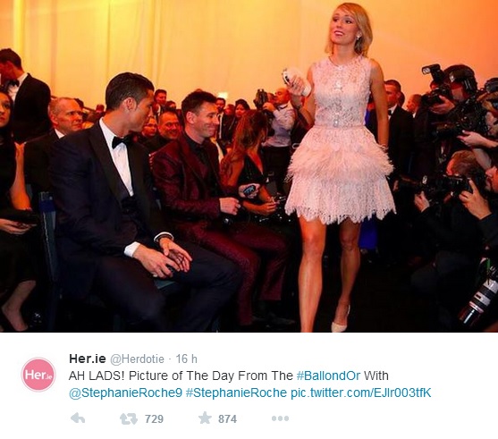 ROMA – La rete realizzata da Stephanie Roche, in lizza per il “Premio Puskas”, dedicato al gol più bello dell’anno, non ha vinto, ma sicuramente la calciatrice irlandese ha guadagnato l’attenzione dei colleghi. Infatti Cristiano Ronaldo e Lionel Messi non hanno nascosto la loro ammirazione per lei durante la cerimonia che si è tenuta a Zurigo. I due sono stati immortalati con lo sguardo fisso sulle sue gambe e la 25enne ha poi ritwittato la foto con la didascalia: “Ah, i ragazzi!”.
