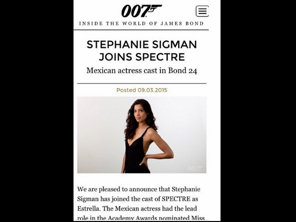 ROMA – Malgrado le riprese di “Spectre”, il nuovo film di James Bond, vadano avanti a Roma già da diverse settimane, il cast della pellicola ha annunciato la presenza di una nuova Bond-Girl che affiancherà le altre due presenze femminili Monica Bellucci e Lea Seydoux. Si tratta di Stephanie Sigman che interpreterà Estrella, personaggio di cui non è stato rivelato nulla. L’ingaggio dell’attrice messicana Sigman è stato annunciato con un Tweet sul canale ufficiale di Bond.