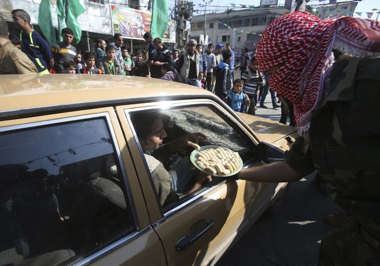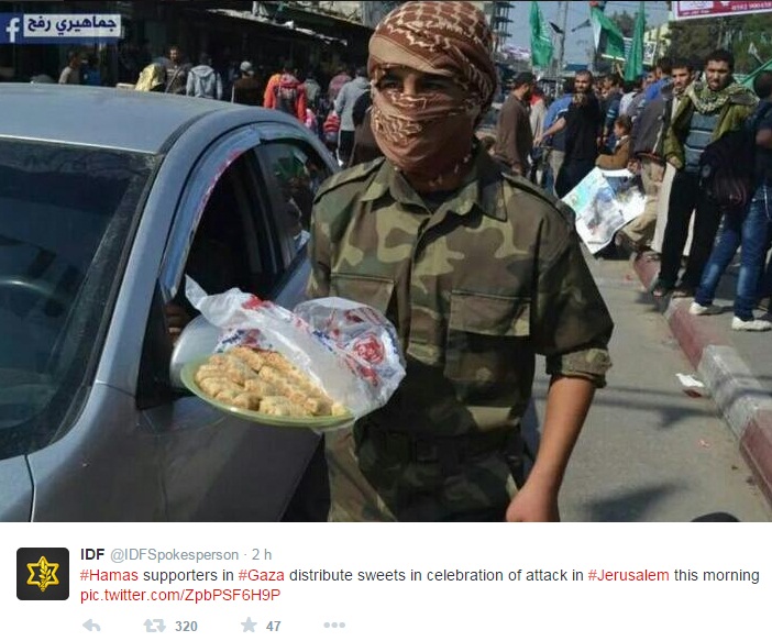 GAZA CITY – I guerriglieri di Hamas festeggiano il massacro alla sinagoga di Gerusalemme offrendo dolci ai passanti, nella Striscia di Gaza.