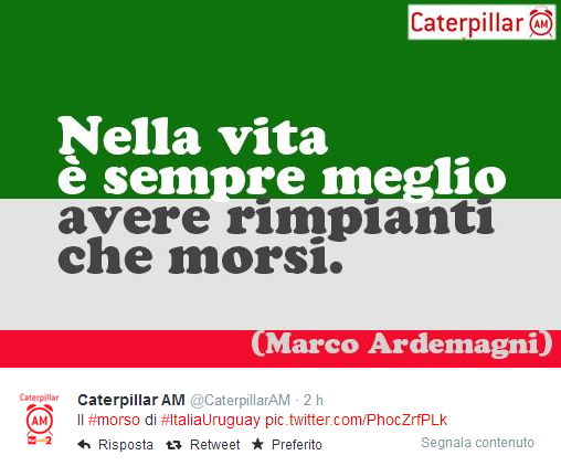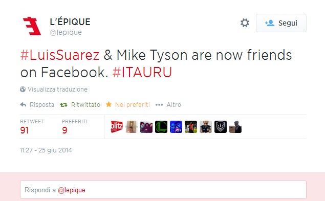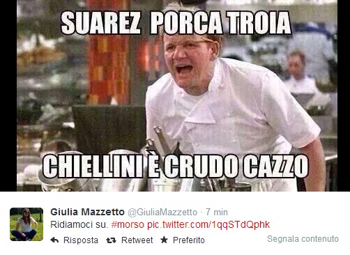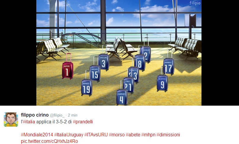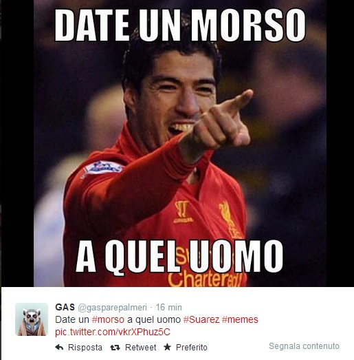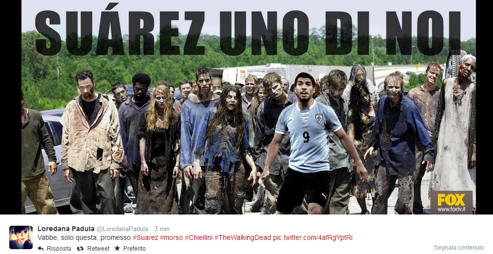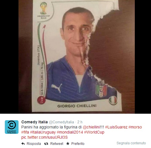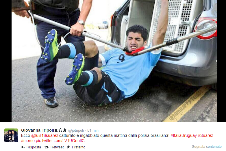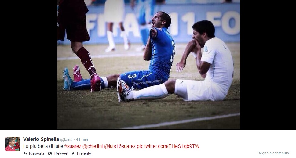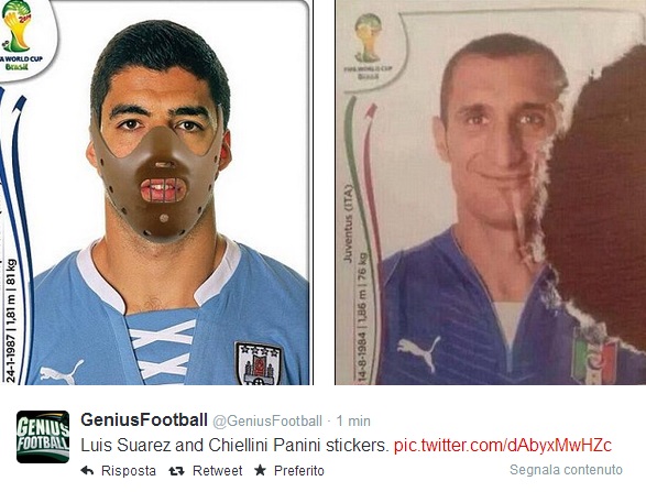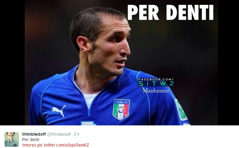 ROMA – C’è la prima pagina del Tempo, ma sopratutto ci sono i tanti fotomontaggi sul morso di Suarez a Chiellini per digerire (e forse è proprio il caso di dirlo) al meglio la sconfitta contro l’Uruguay. Il morso di Suarez passerà alla storia (moviola o no, Lugano o no) e su Twitter è scattata la corsa al fotomontaggio. Eccone qualcuno in ordine sparso.