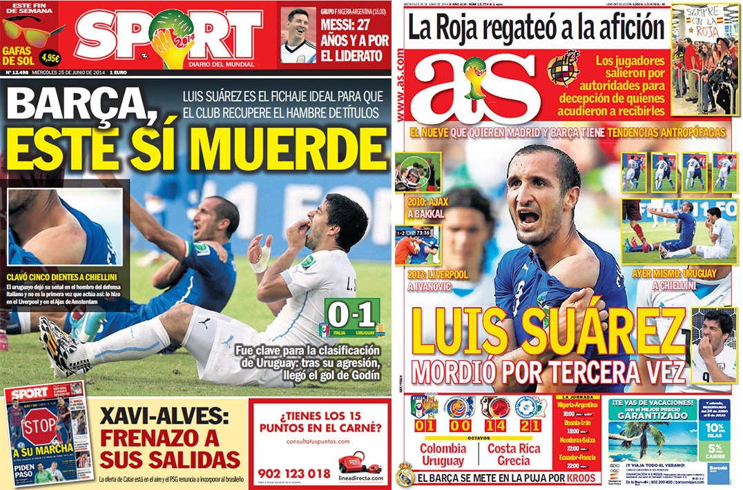 Inoltre l’attaccante della Celeste e del Liverpool è recidivo: con quello rifilato a Chiellini, sono tre i morsi in carriera. Il primo fu a Bakkal durante una sfida tra Ajax e PSV nel 2010, il secondo a Ivanovic, durante un match fra Liverpool e Chelsea nel 2013.
