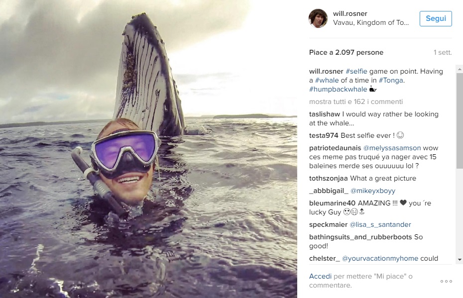 Il giovane falegname australiano ha pubblicato sul suo profilo Instagram le foto della sua incredibile vacanza in giro per il mondo, tra spiagge paradisiache e luoghi straordinari, suscitando l’apprezzamento degli amici e magari anche qualche gelosia, per chi invece rimane seduto nel suo ufficio e guarda sognante quei luoghi dal suo posto di lavoro. L’ultima foto però non può che destare un sorriso in chi la guarda ed è stata scattata a Tonga, nell’oceano Pacifico, dove il fortunato Will si è trovato a nuotare insieme ad almeno sei balene per sei ore e nella foto, alle sue spalle, appare una megattera di circa 15 metri che emerge dalle acque e sembra quasi mettersi in posa.