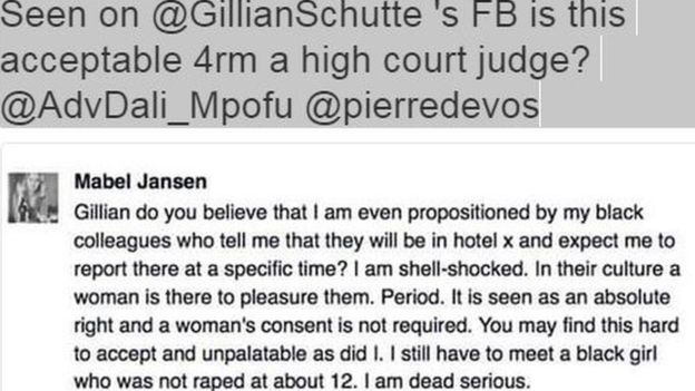 La destinataria dei messaggi è Gillian Schutte: la donna ha deciso di rendere pubblici questi messaggi per denunciare quanto ramificato sia il livello di razzismo nel suo Paese. La giudice si è difesa pubblicamente che i suoi messaggi sono stati pubblicati privi del contesto e potevano essere fraintesi.