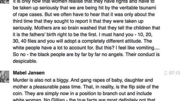 ROMA – Un giudice, e alcuni suoi messaggi su Facebook, hanno acceso per l’ennesima volta il dibattito sul razzismo in Sudafrica. Al centro della polemica c’è Mabel Jansen, una donna giudice bianca. L’anno scorso la donna ha scritto su Facebook, privatamente, a un’attivista dei diritti umani alcune considerazioni maturate dopo una lunga esperienza come magistrato. Ebbene secondo Jansen i neri avrebbero “per cultura” familiarità con reati come lo stupro, la pedofilia, l’omicidio. Per loro non sono gravi. Ecco cosa ha scritto la giudice: