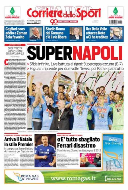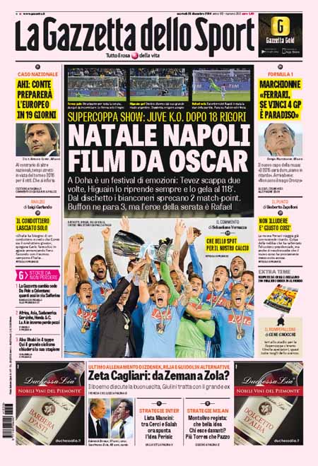 ROMA – “Natale Napoli” titola la Gazzetta dello Sport il giorno dopo la vittoria della Supercoppa italiana della squadra di Rafa Benitez. Il Napoli ha vinto dopo 18ย rigori (i tempi regolamentari si erano chiusi sul 2-2). Decisiva la doppietta di Higuain e le parate di Rafael dal dischetto. La Juventus di Allegri impatta cosรฌ sul muro alzato da Benitez, al decimo trofeo in carriera. A vincere non รจ solo il Napoli ma รจ il calcio italiano. Due anni fa finรฌ a palate di fango, come scrive la Gazzetta dello Sport, stavolta รจ uno show.