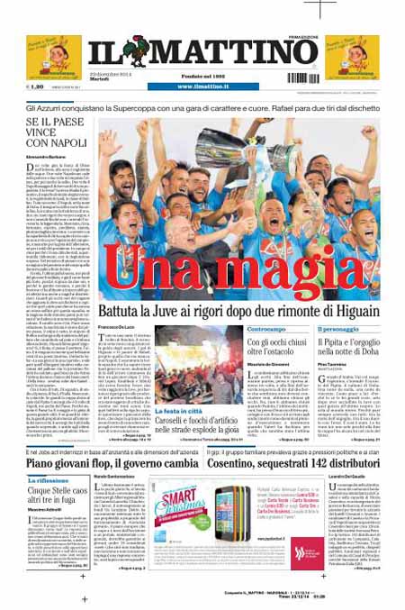 “Napoli, la Supercoppa รจ tua” รจ il titolo dell’edizione online del Mattino. In home page anche la festa dei tifosi napoletani per la cittร . “Se il paese vince” รจ il titolo dell’editoriale del direttore, Alessandro Barbano. “Due volte gira la barca di Ulisse nellโinferno ย scrive Barbano – alla terza รจ inghiottita dalle acque. Due volte Napoleone cade nella polvere e due volte riconquista lโaltare, per poi morire in esilio. Due volte il Napoli assaggia il dolore sordo di una pugnalata. E la terza? La terza ribalta il pronostico, il superbo dominio degli avversari, la neghittositร dei pali, la classe di Buffon. Tutto sovverte, il Napoli, nella notte di Doha. E insegue la cattiva sorte fino alla fine, la incalza con la freddezza di uno, due, tre, tanti rigori che vanno a segno, e non sโarrende finchรฉ non sโarrende lโavversario, la leggendaria, blasonata, ricca, fortunata, esperta, prediletta, aiutata, plurimedagliata Juventus”.