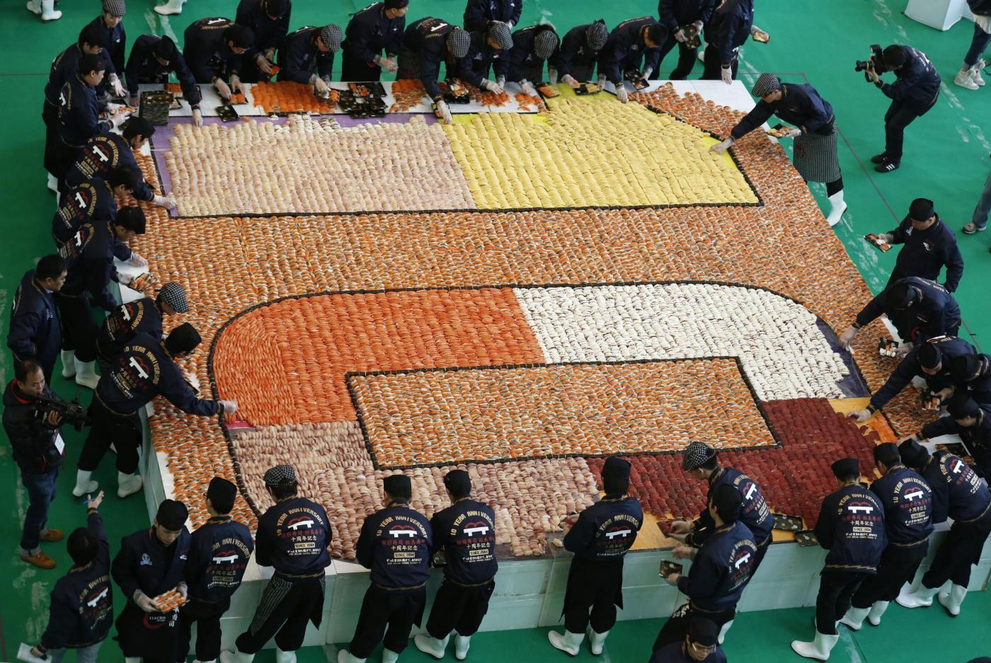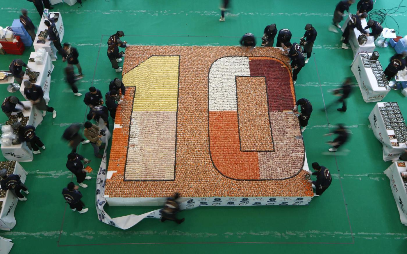 Gli chef hanno ricoperto di pesce crudo un’area di 37,57 metri quadrati, battendo il precedente primato di un gruppo norvegese di 31,59 metri quadrati. L’impresa è stata organizzata dalla Itacho Sushi per celebrare i dieci anni di attività: alla fine della gara il sushi posizionato a “mosaico” con su scritto un enorme 10, è stato confezionato e regalato ai clienti (foto LaPresse)