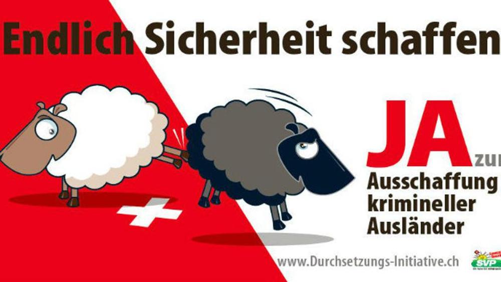 “Si vota il 28 febbraio e Zurigo è ricoperta dai poster con le pecore bianche che prendono a calci quelle nere, propaganda già definita «pericolosa» dalle Nazioni Unite nel 2007, rimasticata ed esposta senza remore nel 2010 per un altro referendum riguardo ai diritti di cittadinanza e ora rispolverata per la terza volta con grande sfoggio di creatività con qualche aggiunta. Il calcio prima stava sopra una generica bandiera rosso-crociata ora sta in un ipotetico confine con i colori della bandiera. La stessa campagna truce per tre occasioni diverse. Neanche uno sforzo di fantasia per stuzzicare i bassi istinti”.