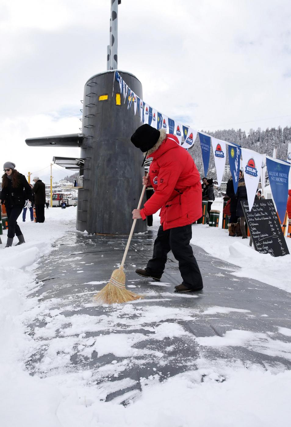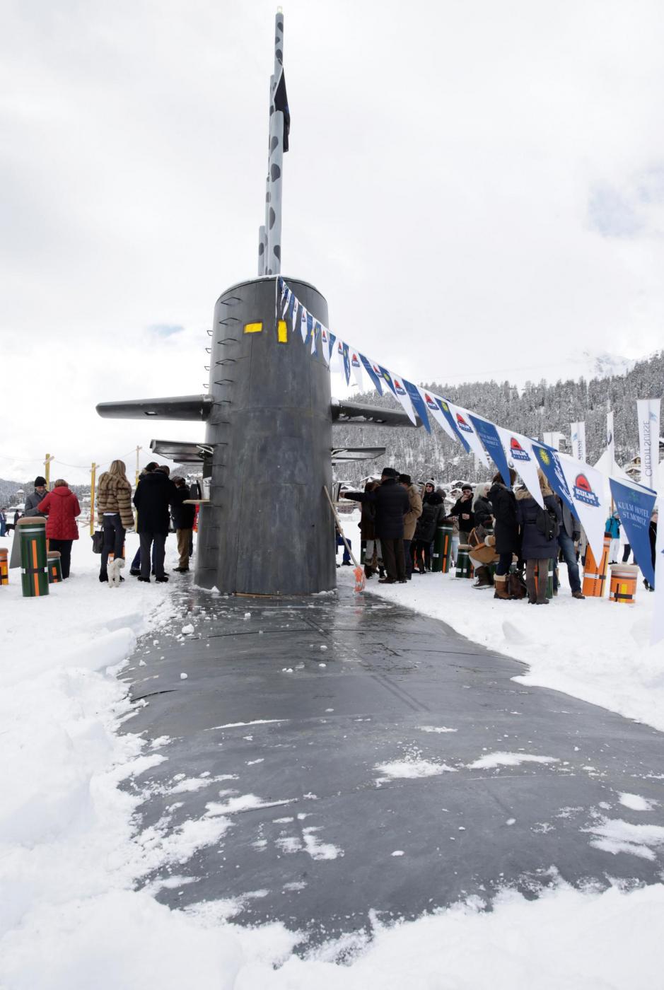 È l’iniziativa nata da una collaborazione fra un hotel di lusso della città, il Kulm hotel St. Moritz, e l’artista Andreas Reinhard. Il sottomarino è infatti una installazione dell’artista. L’inaugurazione è avvenuta in queste ore: e a bordo, per festeggiare è stato servito dello champagne.