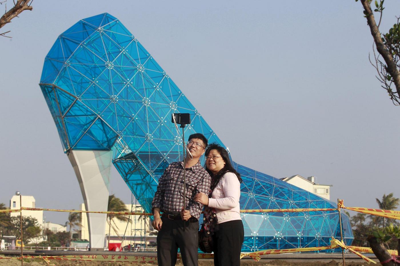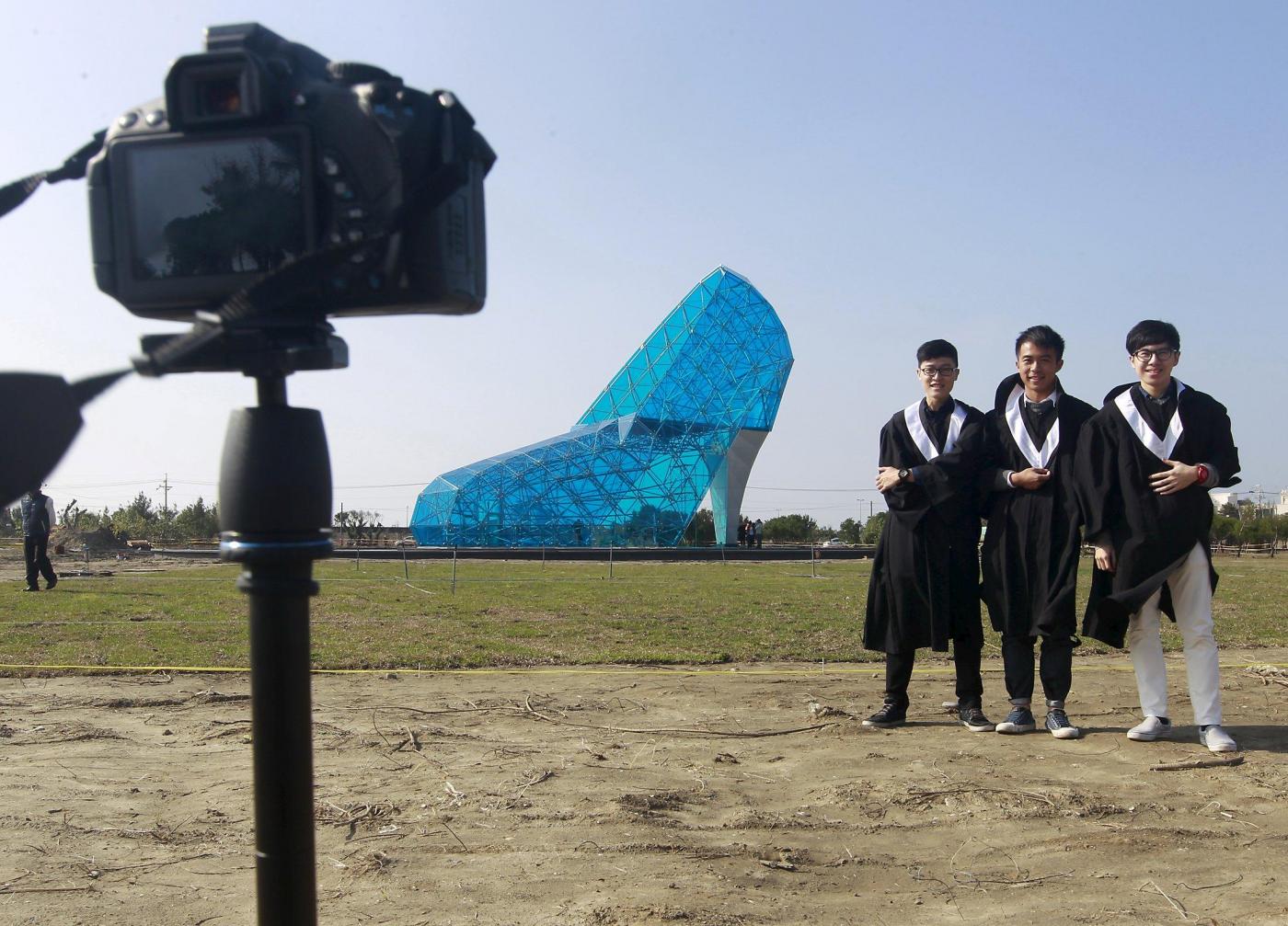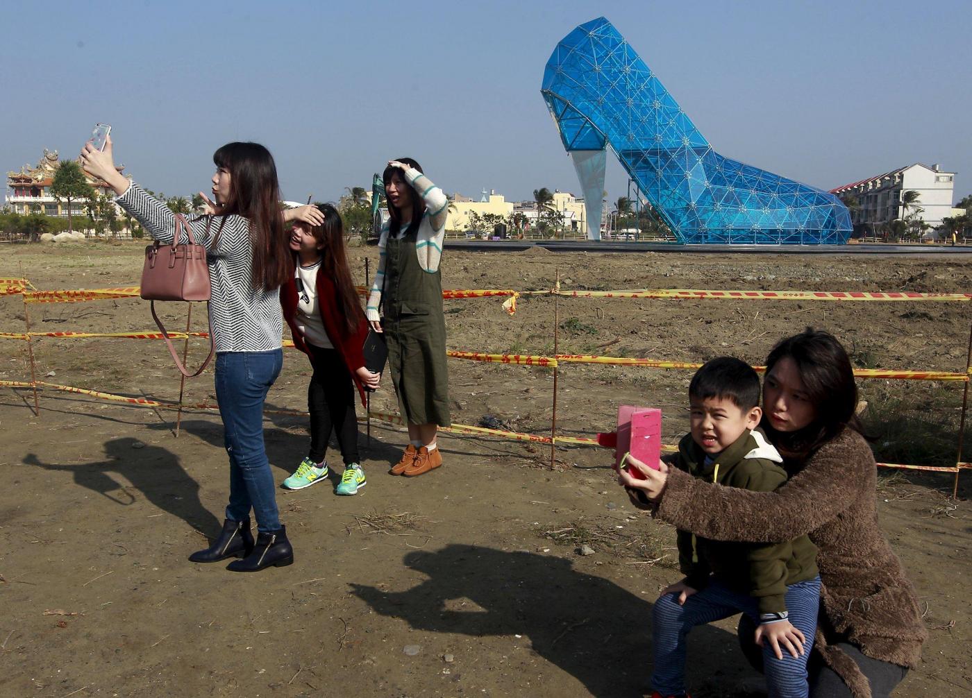 People take selfies in front of a shoe-shaped church in Chiayi, southern Taiwan, January 18, 2016. The church, which is about 17 meter (55 feet) tall and 11 meter (36 feet) wide, took three months and about $685,000 to build. It is expected to open in February 2016, before the Lunar New Year, according to the Chiayi county government official. REUTERS/Pichi Chuang EDITORIAL USE ONLY. NO RESALES. NO ARCHIVE