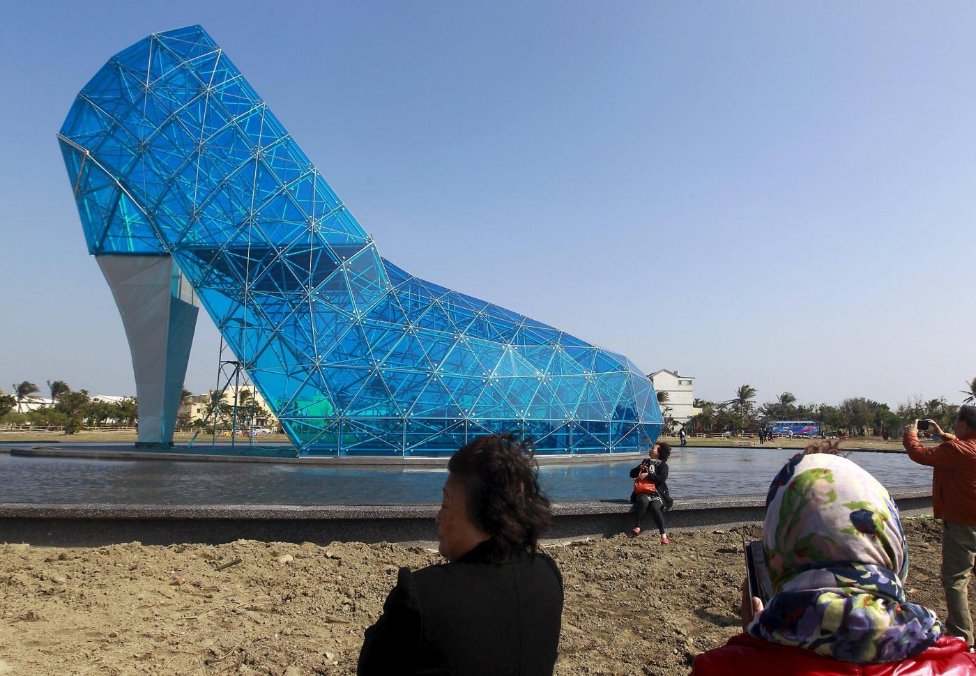 People take pictures in front of a shoe-shaped church in Chiayi, southern Taiwan, January 18, 2016. The church, which is about 17 meter (55 feet) tall and 11 meter (36 feet) wide, took three months and about $685,000 to build. It is expected to open in February 2016, before the Lunar New Year, according to the Chiayi county government official. REUTERS/Pichi Chuang EDITORIAL USE ONLY. NO RESALES. NO ARCHIVE