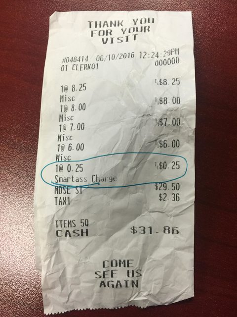 ROMA – Pagare di più la consumazione nel locale causa “tassa” sull’ironia. Questo è quanto è capitato ad un uomo che ha raccontato di aver trovato una voce “smartass” di 25 cent sul suo scontrino fiscale, una tassa sull’intelligenza o sull’ironia. A raccontare la sua storia su Imgur è l’utente briancjackson, che ha pubblicato la foto dello scontrino con tanto di voce “smartass charge“, letteralmente “tassa intelligentone”, rimanendo stupito dall’insolito rincaro.