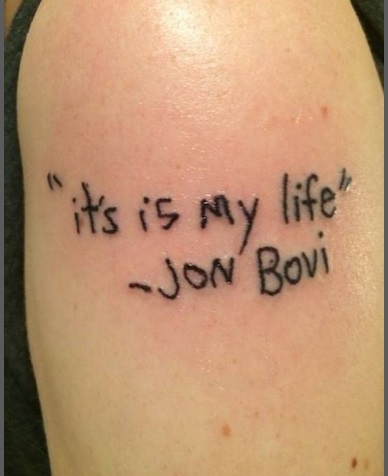 La frase doveva essere “It’s my life” ma viene trasformata in”It’s is my life”. Anche il nome del cantante, Jon Bovi, al posto di Bon Jovi. E la foto pubblicata in Rete è stata ripostata da migliaia di utenti. Il Corriere della Sera, a questa immagine ne associa altre e realizza una divertente gallery dal titolo “Tatuaggi, quando il refuso è marchiato sulla pelle” che Blitz vi ripropone.