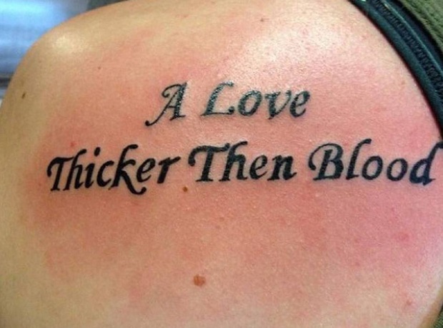 “A love thicker then blood ” (dovrebbe essere “than blood”). Dovrebbe essere “un amore più denso del sangue”
