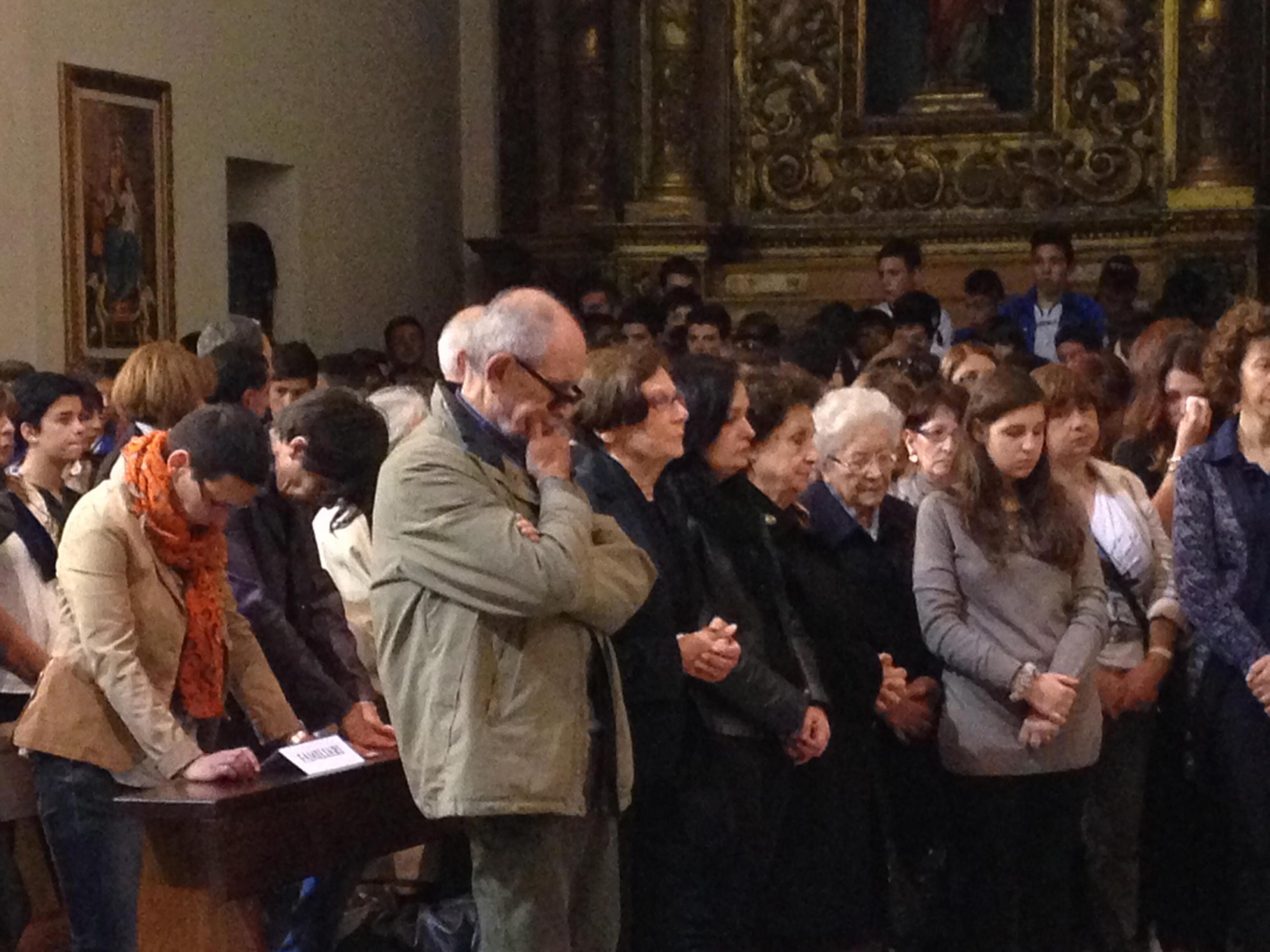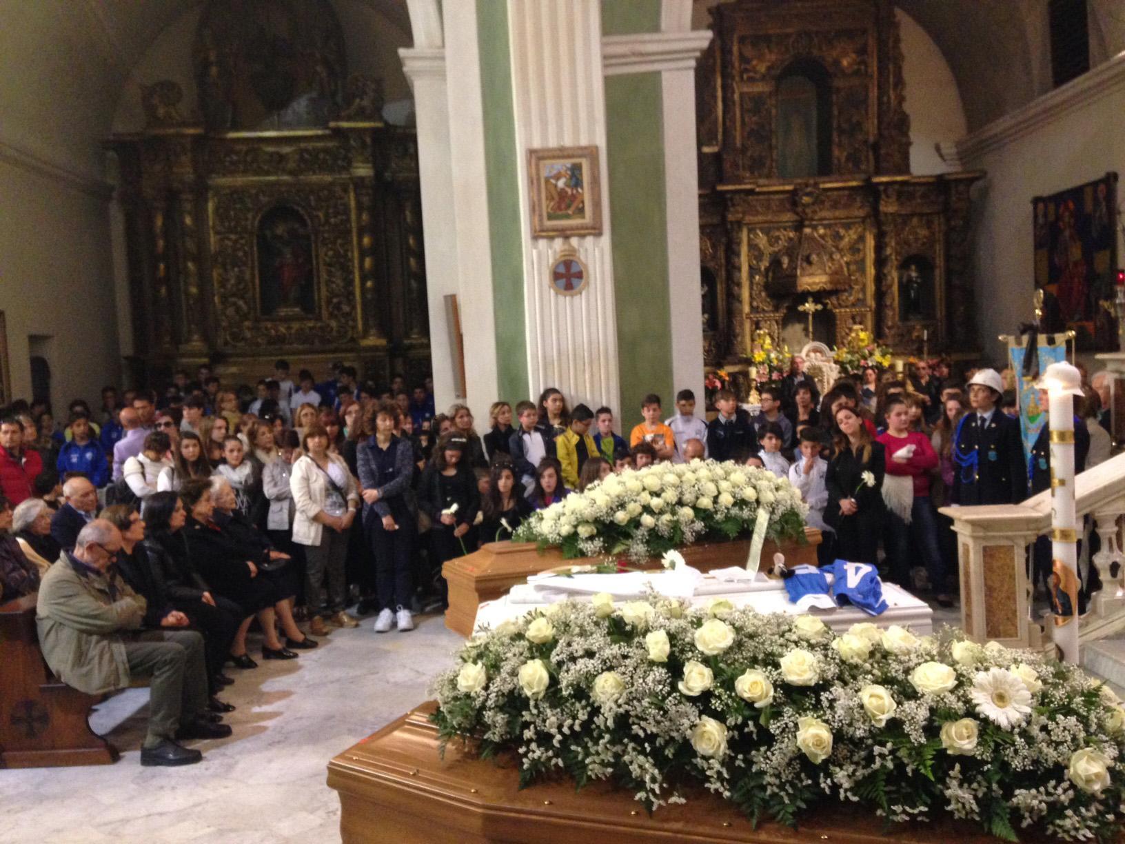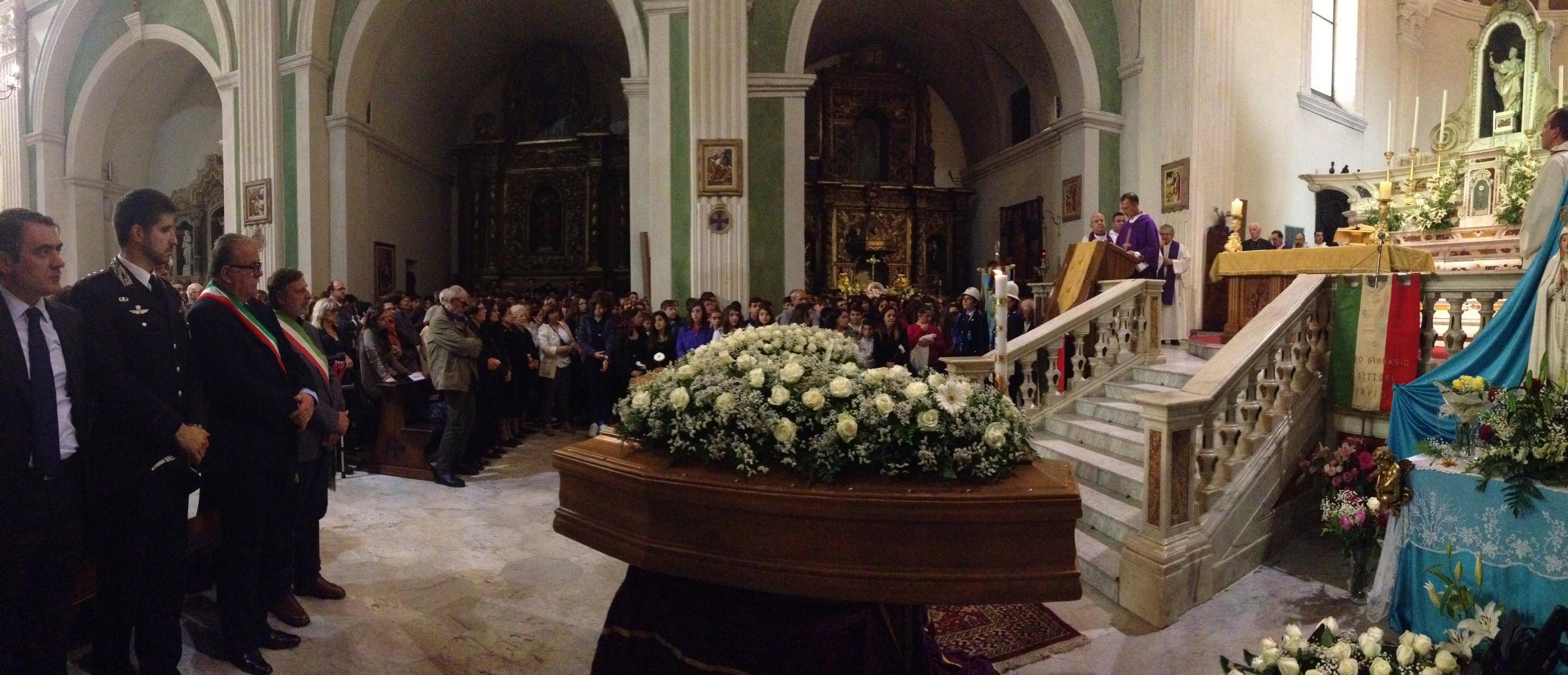 Nei primi banchi i genitori dei due coniugi e i compagni di classe del piccolo Pietro, la cui bara era avvolta dalla maglia della sua squadra di calcio(foto LaPresse)
