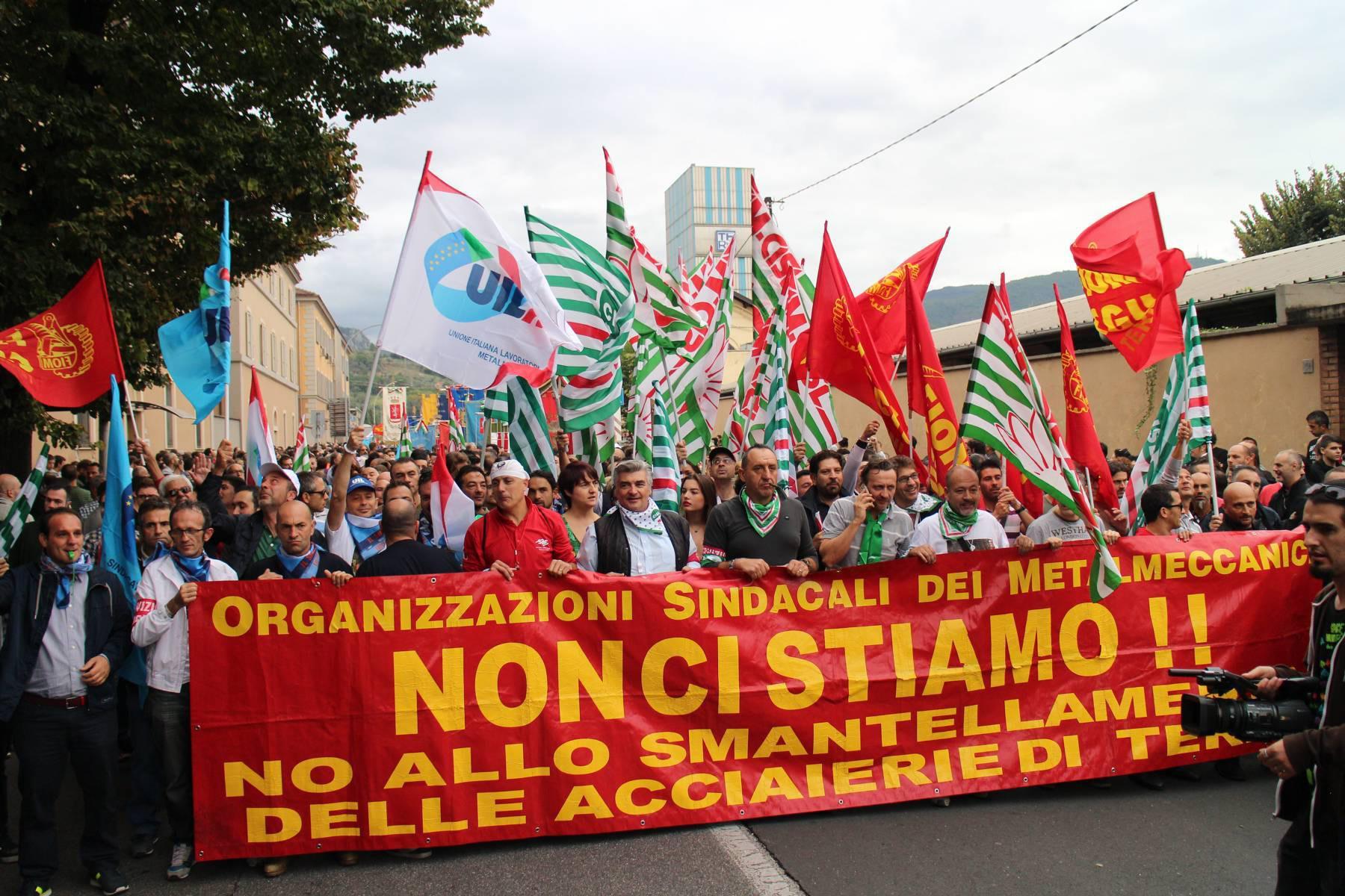 Intanto Terni non si piega. E con gli operai ci sono proprio tutti: lavoratori delle altre aziende in crisi, cittadini e studenti, che si sono radunati alle 9.30 davanti ai cancelli della fabbrica di viale Brin. Da lì si è snodato il corteo organizzato dai sindacati, lungo oltre un km, che ha attraversato le vie del centro. Due ali di folla si sono radunate attorno ai manifestanti che indossavano le magliette con su scritto: “L’acciaieria non si tocca”. In corteo c’erano anche famiglie con i passeggini. Cartelli e striscioni di solidarietà sono stati esposti anche sui balconi delle case e sulle serrande dei negozi: “Io sto con Terni”. “Chiudiamo oggi perché non chiuda la città domani”. In strada una finta bara rossa con la scritta: “La fine di Terni”. Tra gli slogan urlati: “L’acciaieria non si tocca la difenderemo fino alla lotta”, “se non cambierà lotta dura sarà” e “chi non salta un tedesco è”.