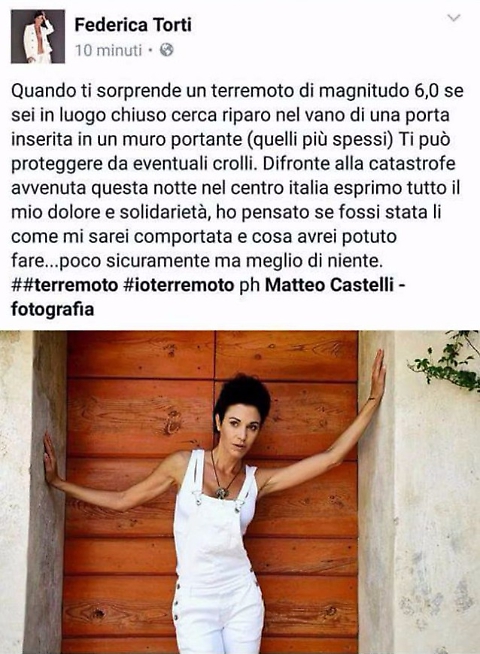 ha scritto Federica Torti nel post poi cancellato. Quindi, qualche hashtag “#terremoto #ioterremoto”, e il credit del fotografo dello scatto condiviso: “ph Matteo Castelli-fotografia”.