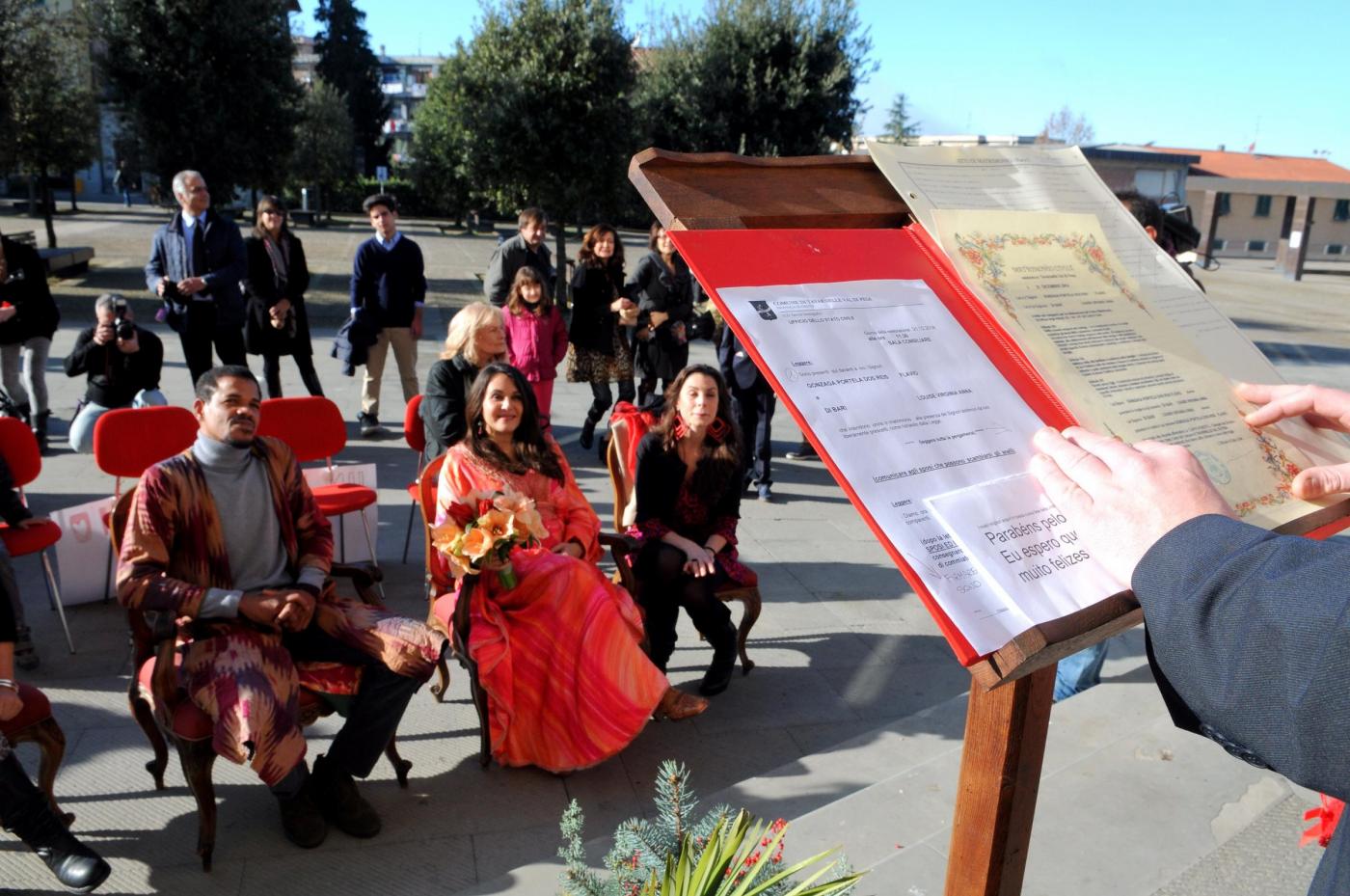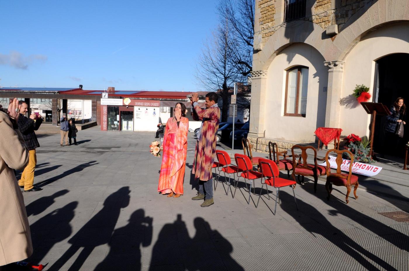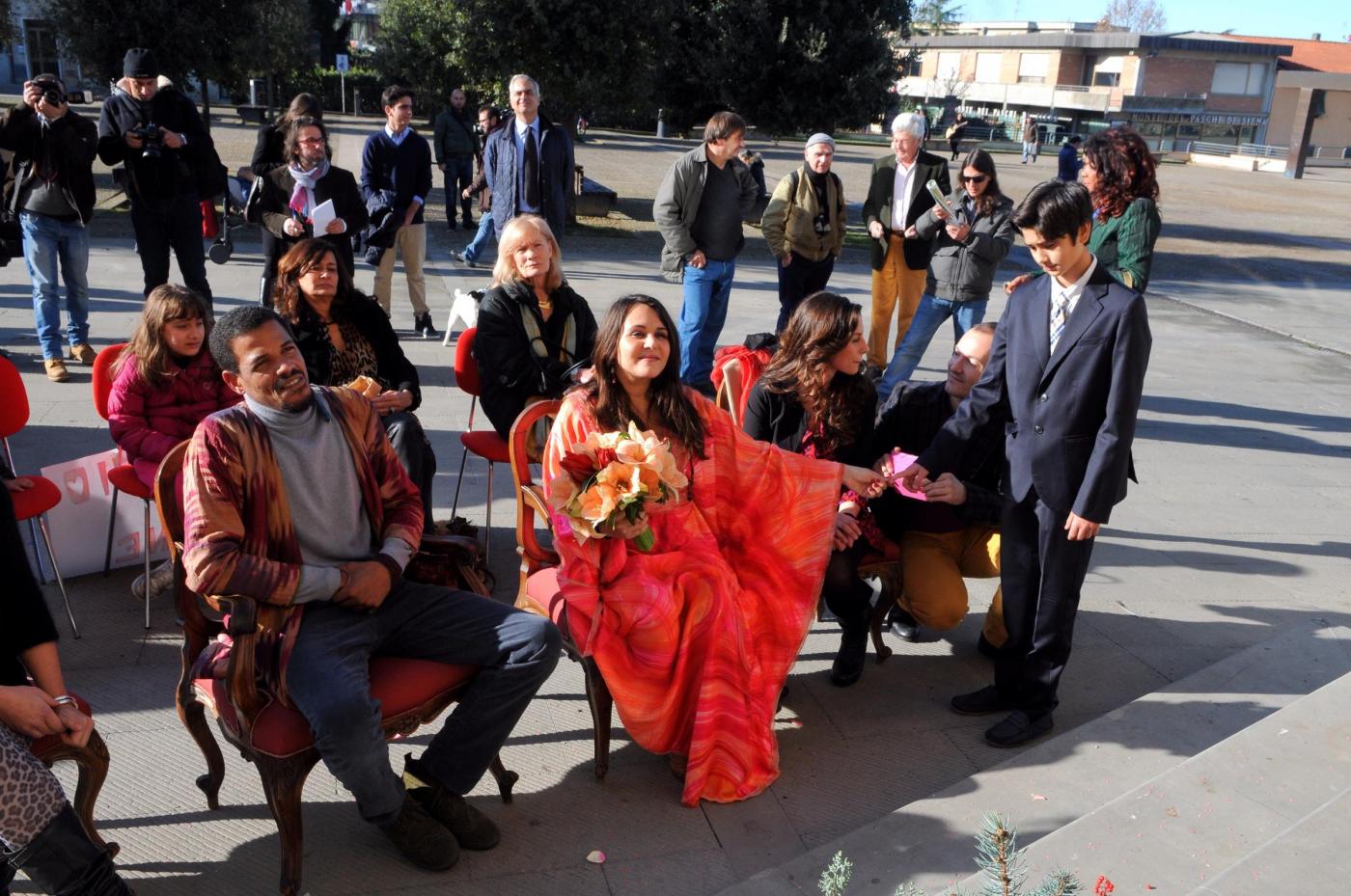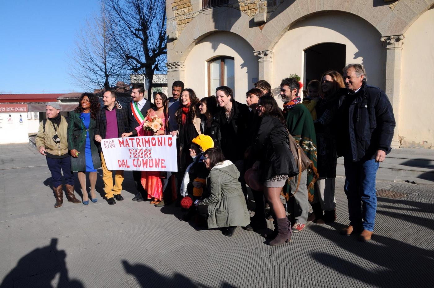 Gli amici della coppia, lei olandese lui brasiliano, hanno preparato lo striscione: “Un matrimonio fuori dal comune”. E in effetti le nozze di questi due trentenni, malgrado le temperature non proprio alte si sono tenute all’aperto a causa dello sciame sismico che da giorni colpisce quell’area della Toscana e ha costretto i sindaci a dichiarare inagibili le chiese e gli uffici pubblici. Le foto intanto hanno fatto il giro del web (foto LaPresse)