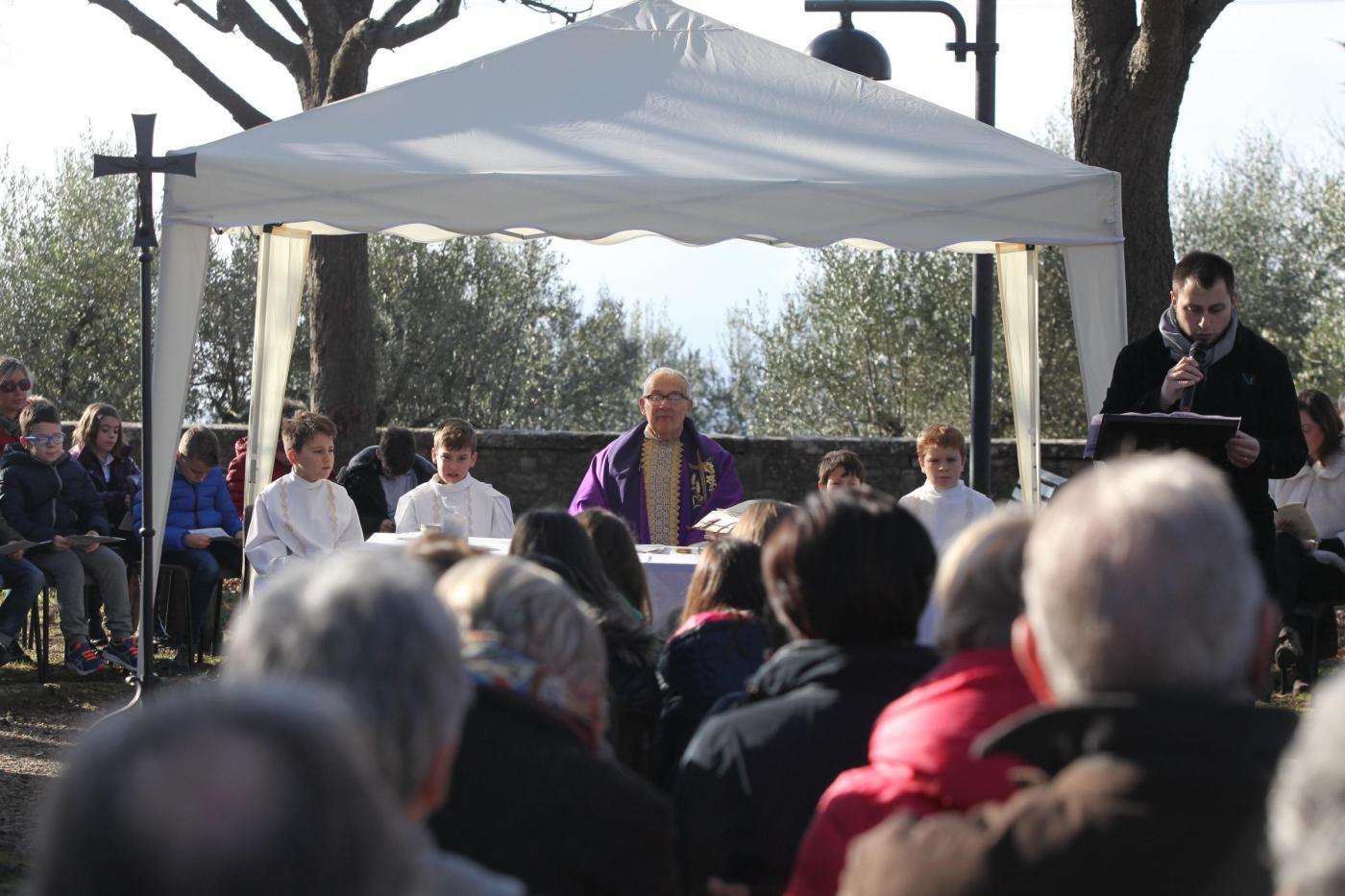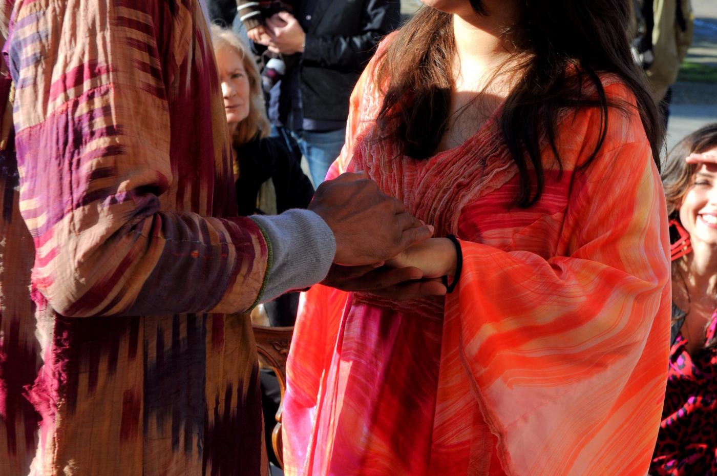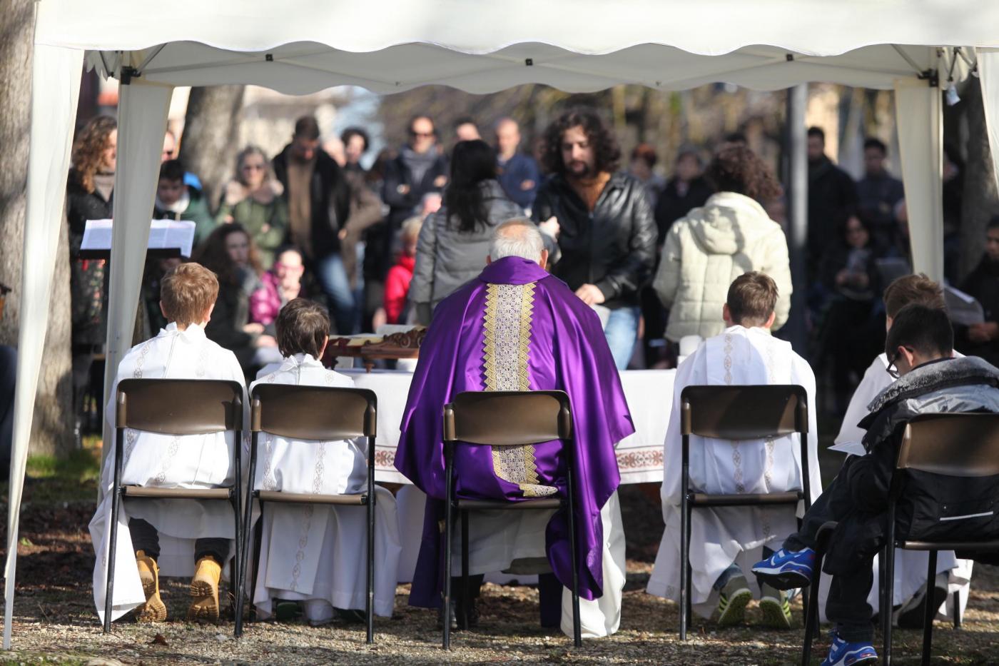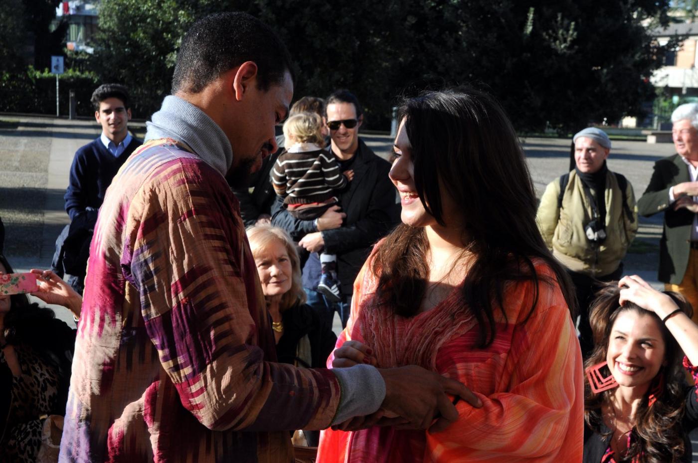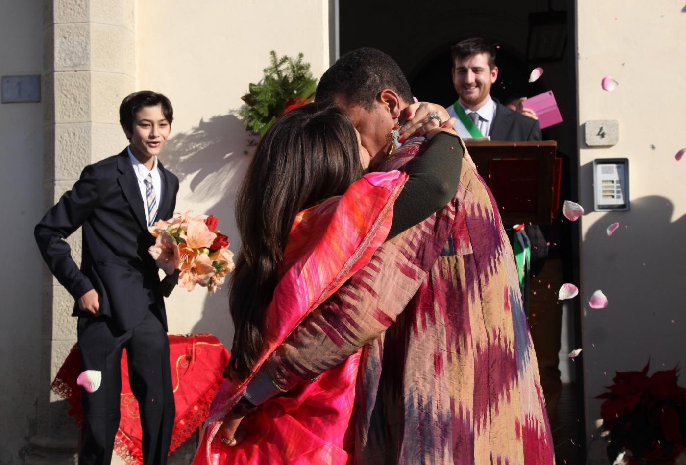 Gli amici della coppia, lei olandese lui brasiliano, hanno preparato lo striscione: “Un matrimonio fuori dal comune”. E in effetti le nozze di questi due trentenni, malgrado le temperature non proprio alte si sono tenute all’aperto a causa dello sciame sismico che da giorni colpisce quell’area della Toscana e ha costretto i sindaci a dichiarare inagibili le chiese e gli uffici pubblici. Le foto intanto hanno fatto il giro del web (foto LaPresse)
