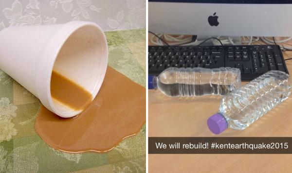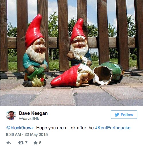 Ma mentre c’era chi immaginava scenari apocalittici di esplosioni e aerei caduti, su Twitter si è scatenata la proverbiale ironia inglese: al rimorchio di hashtag sarcastici come #prayforkent (pregate per il Kent) #wewillrebuilt (ricostruiremo) e #neverforget (non dimenticheremo) gli utenti hanno iniziato a postare le foto degli effetti “devastanti” della scossa: biancheria caduta dallo stendino, gelati rovesciati, sedie riverse a terra e qualche cassonetto. Non esattamente scene da panico.