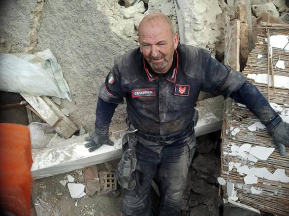 PESCARA DEL TRONTO – La polvere delle macerie del terremoto non nasconde la stanchezza sul viso di Romolo De Matteis , il carabiniere che ha soccorso i terremotati di Pescara del Tronto . Una foto scattata tra le macerie del paese crollato sotto la forza del sisma, un intero paese spazzato via. Un uomo, un carabiniere fotografato dopo aver salvato vite umane, stremato e completamente coperto di polvere.