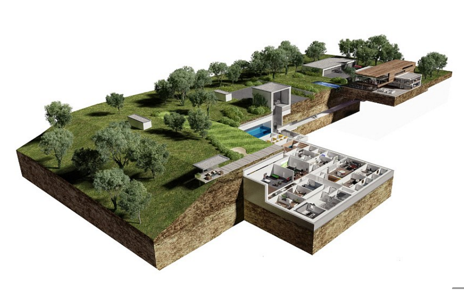 Lungi dall’essere un austero rifugio per tempi di crisi, guerre e conflitti, il rifugio per miliardari gode di tutti i lussi: ci sono stanze arredate fastosamente e dotate di tutti i confort, camere per i bambini con la porta a prova di bomba, bagno con vasca idromassaggio, la stanza cinema, la club house con il biliardo e altre amenità per il tempo libero nel bunker, la piscina, la palestra, la spa e persino un bar. C’è persino un giardino sotterraneo in cui arditi giochi di luce simulano la luce naturale.